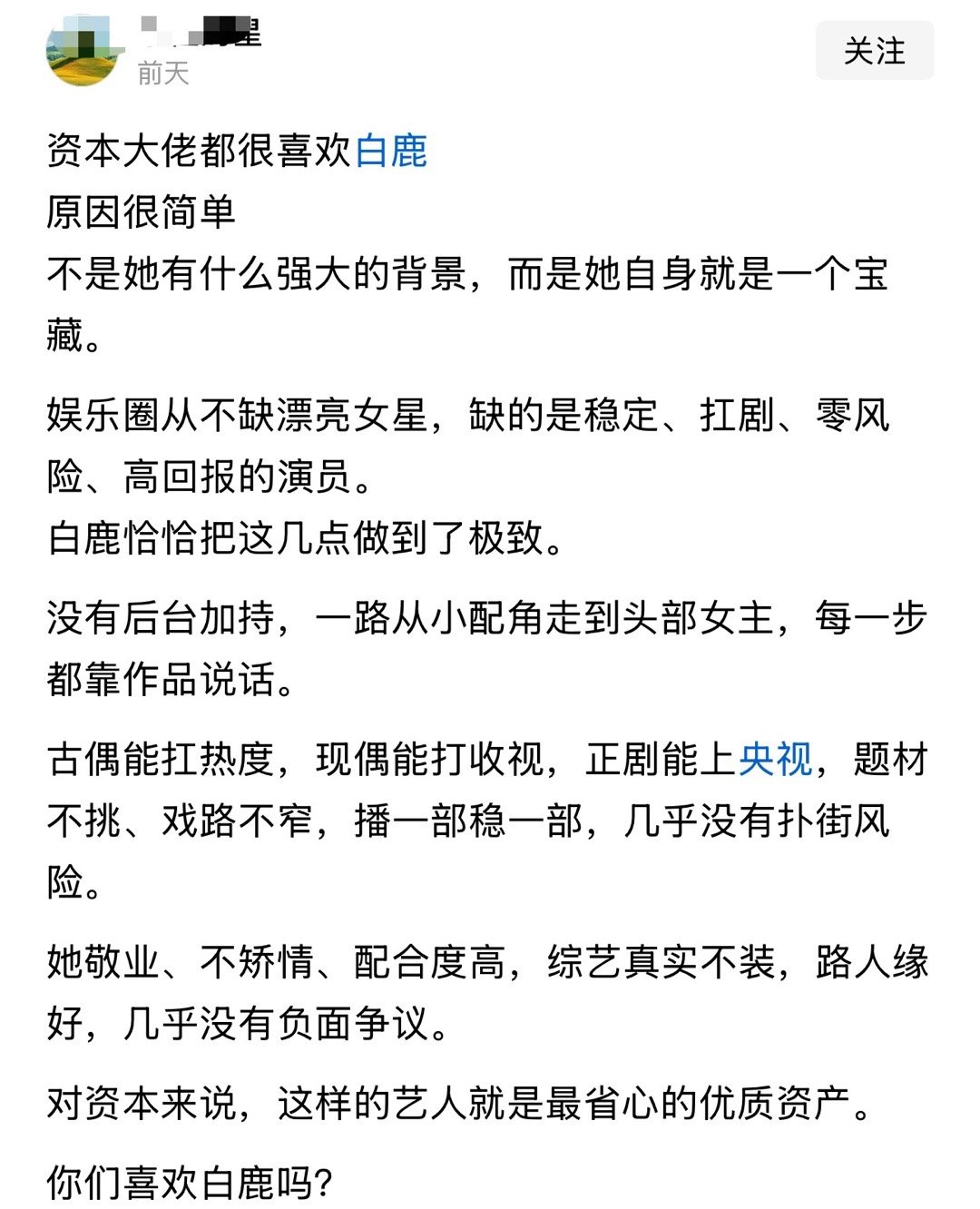 资本大佬都很喜欢白鹿原因很简单
