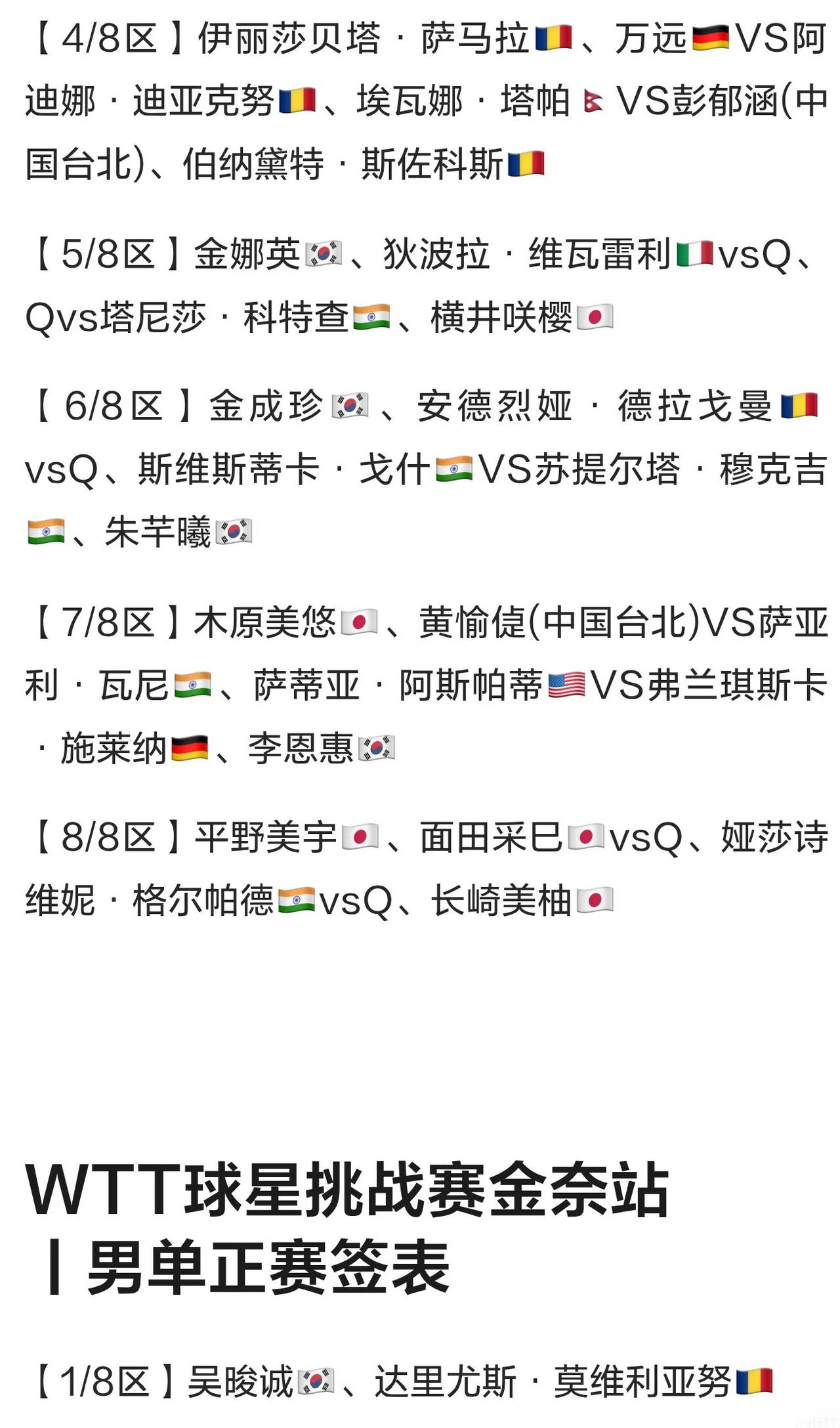 WTT金奈球星挑战赛男女单及双打签表出炉 2月10日至15日举行WTT金奈球星挑战赛正赛签表出炉, 国乒队没有报名参加此次比赛, 日乒张本智和兄妹也没有参赛, 美和是临时退赛。 签表显示, 大藤沙月是一号种子, 芝田沙季与佐藤瞳在2/8区, 郑怡静退赛亚洲杯,参加了 金奈站比赛,想不明白为什么? 平野美宇与长崎美柚一个区, 估计平野打不过长崎吧! 男线方面,吴俊诚,赵大成, 冯翊新,朴康贤等参加了这站比赛, 吴俊诚有望夺冠🏆, 球星挑战赛冠军积分600, 国乒主力不参加, 外协参加的兴致盎然!