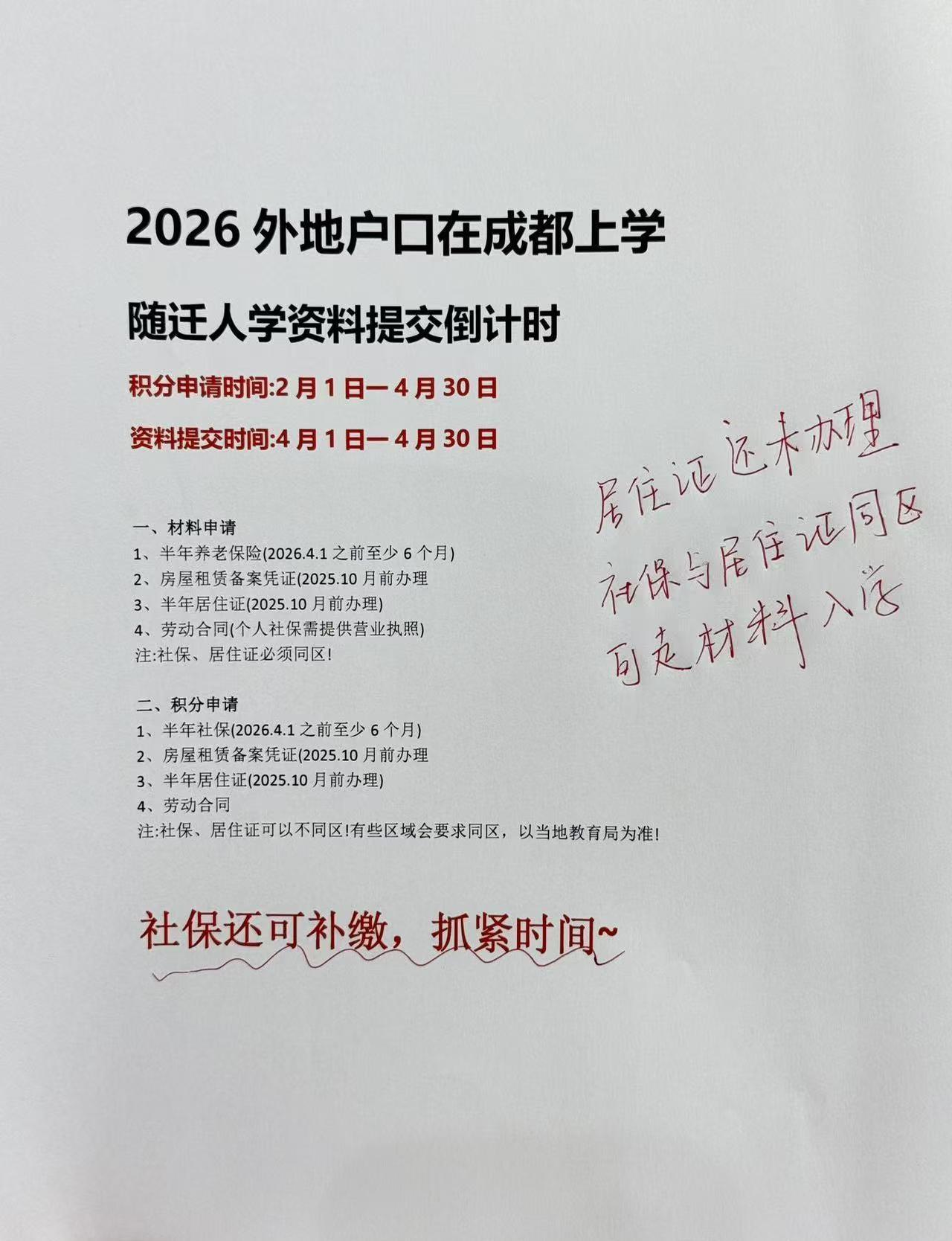 2026外地户口在成都上学,随迁材料提交开始 各位家长注意 积分申请材料提交已经开始 请各位家长提前做好积分申报 4月统一提交材料,方便审核入学 如果还未缴纳满半年社保的家长 可以申请一次性补缴 读书 随迁 随迁子女 随迁子女入学