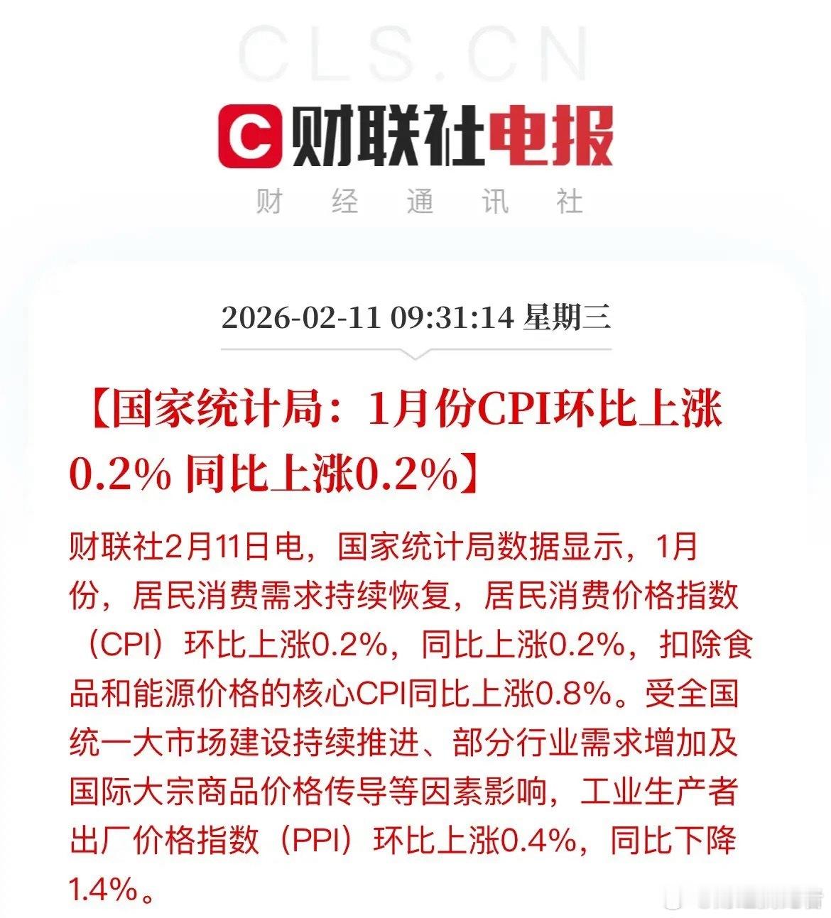 同比环比双降,1月CPI环比涨幅0.2%,低于预期,同比涨幅0.2%,PPI同比下降1.4%,降幅比上个月收窄