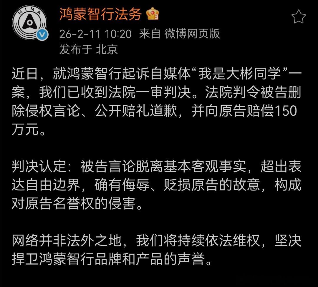 “我是大彬同学”侵害鸿蒙智行名誉权一案,有了初步的结果,被告被判罚150万,这样的结果只能说一句大快人心!