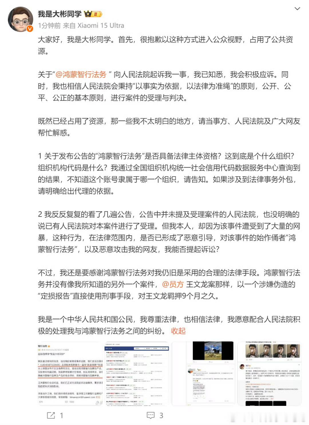 近年来,鸿蒙智行一直被不明来源的水军和黑公关攻击造谣,以大彬同学为首的一部分博主,肆意捏造,诋毁鸿蒙智行,肆无忌惮的攻击品牌与车主,对品牌造成了极大的伤害。以为使用阴阳怪气,名称代指就可以躲避法律的制裁,目前来看还是太天真了。