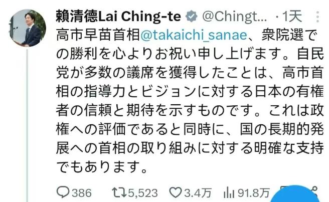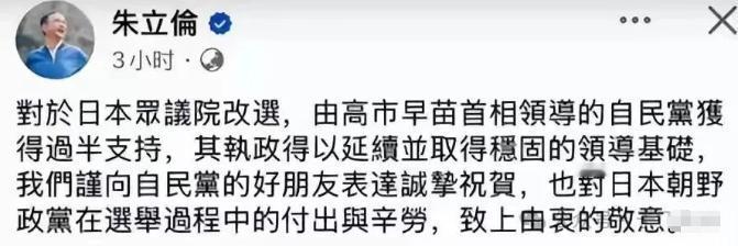 这百年烂党真是扶不起的!2月8日,国民党前主席朱立伦在社交媒体上发文向好朋友高市早苗表达诚挚祝贺。 日本政坛刚刚完成一场重要选举,结果公布之后,不少人都把目光放在了地区局势上,让人没想到的是,远在海峡对岸的部分人士,动作比谁都快,第一时间就送上祝福,这种着急示好的样子,看得人心里不是滋味。 这场选举的结果没有太大悬念,高市早苗带领的执政阵营拿下足够席位,继续执掌日本政坛。 这位人物的对外态度一向强硬,尤其在涉及台海的议题上多次发表不当言论,不断触碰底线,给地区安全带来不稳定因素,国际社会对此都看在眼里。 选举结果出炉当天,朱立伦就在个人社交平台公开发文,向高市早苗表达祝贺,同时间,岛内另外一些势力也同步跟进,用同样热情的态度向对方示好,明明是日本的内部选举,他们却比关心自身发展还要积极,这份热情用错了地方,也用错了对象。 台湾是中国不可分割的一部分,也是两岸关系不可动摇的基础,任何涉及台海的议题,都是中国内部事务,轮不到外部势力说三道四,更不允许岛内有人主动迎合,拿民族利益去换取所谓的好感。 高市早苗在公开场合多次就台海问题发表错误言论,无视历史与法理,无视中方多次严正表态,持续破坏地区和平稳定。 这样一位坚持错误立场的人物,岛内本应保持警惕,划清界限,可有些人偏偏反其道而行之,主动上前靠拢,完全不顾及两岸同胞的共同感受。 过去很长一段时间里,不少人都期待岛内相关力量能守住底线,维护两岸关系稳定,推动交流合作。 现实却一次次让人失望,面对外部激进势力,他们没有站稳立场,反而主动送上善意,把原则抛在脑后,把大局当成筹码,这样的做法只会伤害两岸同胞的感情。 这种行为背后,藏着很危险的逻辑,以为讨好外部势力就能获得支持,以为靠别人就能达到自己的目的,完全是打错了算盘,中国的领土主权,从来都不是靠妥协和迎合就能保住的,靠外人撑腰,最终只会搬起石头砸自己的脚。 两岸同胞同根同源,血脉相连不可分割,任何破坏两岸关系、勾结外部势力的做法,都违背历史潮流,违背民心所向,真正为岛内民众着想,就应该把精力放在改善民生、推动两岸合作上,而不是忙着和外部激进政客拉关系。 一味迎合对台海不怀好意的势力,只会让台海局势更加紧张,让普通民众承担风险,不管打着什么样的旗号,不管用什么样的理由,出卖民族利益、破坏领土完整的行为,永远不会被认可,也永远不会有好结果。 民族大义面前,没有模糊空间,没有折中选项,守住一个中国原则,维护国家领土完整,是每个人都该坚守的底线,那些试图靠讨好外人换取利益的人,最终只会被时代抛弃,被人民抛弃。 两岸走向统一,是历史必然,是民心所向。任何逆流而动的势力,都阻挡不了这一大势,只有站在民族大义一边,站在历史正确一边,才能真正为地区带来和平,为民众带来福祉,这才是最该坚持的方向。 大家对此有什么看法呢?欢迎各位在评论区留言!