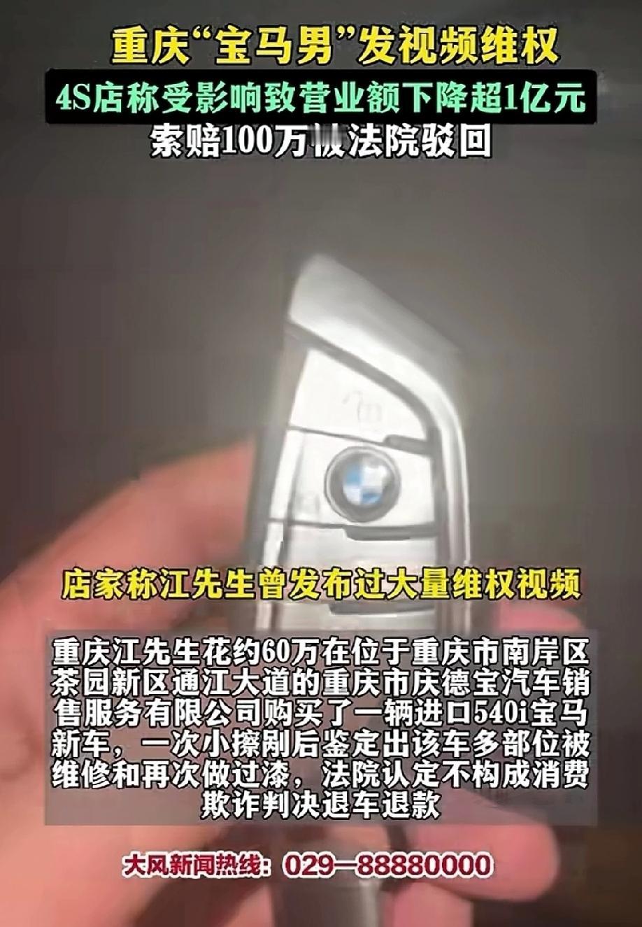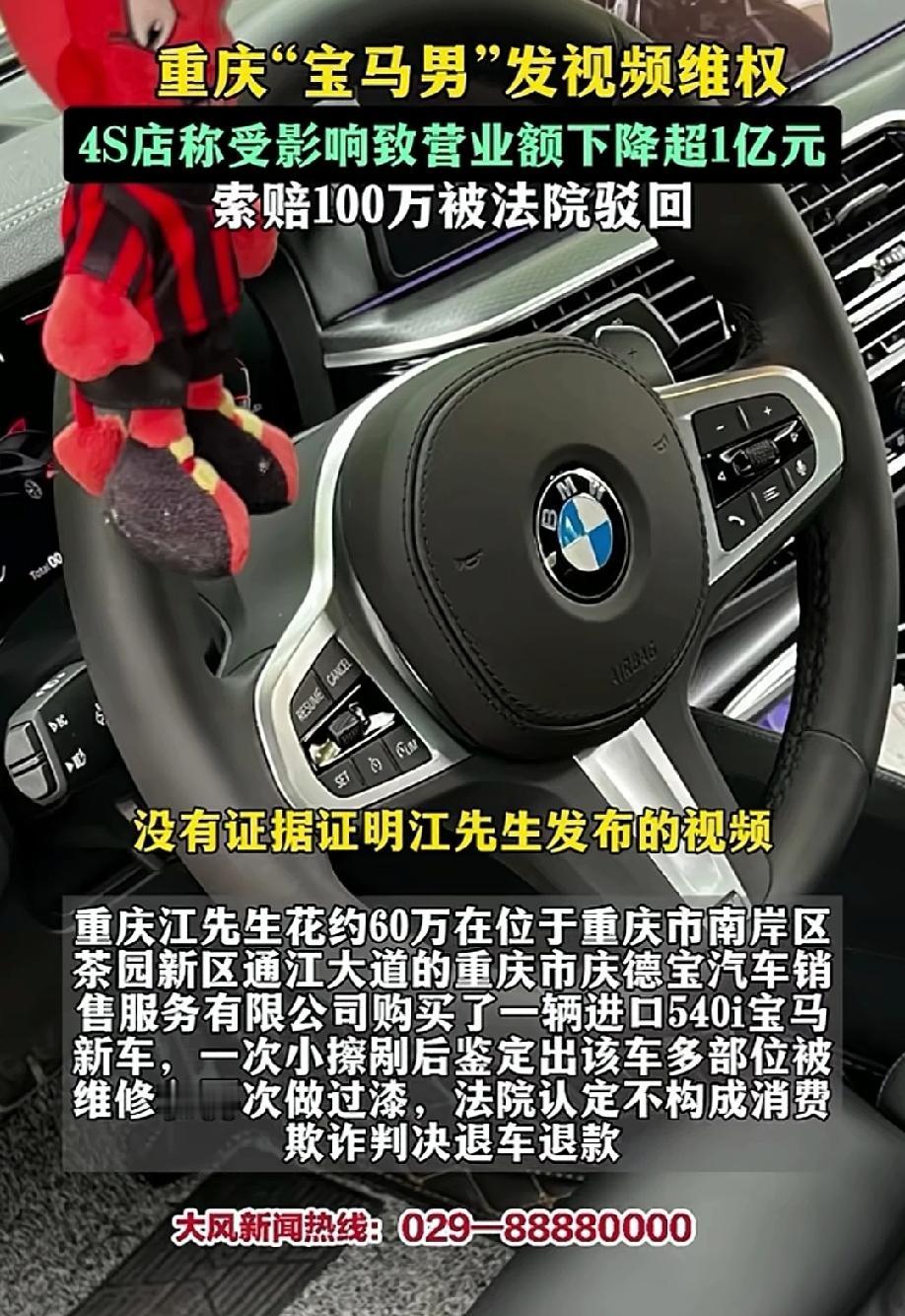 欺诈还有理了?重庆,男子花64万购买了一辆宝马540i新车,一直爱惜的不得了,一次小剐蹭事故后,他去修车才得知,这辆车存在二次维修和补漆情况,并不是新车。男子气不过,把4S店告上法庭,以欺诈为由要求退一赔三,没想到法院仅判退车退款。男子不服,通过网络发视频维权,也让其他车主避避坑。不料,4S店以男子的视频给他们造成不可估量的损失,营业额下降一个亿,并据此向男子索赔100万,并要求男子公开道歉30天,法院这样判! 江先生花64万买了辆宝马新车,谁能想到,这竟然是一辆维修过的车,甚至还被4S店告上法庭索赔100万。 2022年4月,江先生一直心心念念想买一辆宝马540i,经过一番挑选,他在重庆某汽车销售服务有限公司看中了这款车。 为了尽快拿到车,江先生当即和4S店签订了销售合同,车辆成交价58.39万,算上各种费用,落地一共花了64万多元。 拿到新车的江先生格外爱惜,平时开车小心翼翼,就怕车子有一点磕碰,毕竟这可是他花大价钱买来的全新车。 2022年6月20日,意外还是发生了,江先生开车时不小心和其他车辆发生了小剐蹭,导致车辆左前保险杠受损。 看着爱车有了损伤,江先生心疼不已,赶紧把车送到维修店修理。 万万没想到的是,维修师傅检查后告诉他,这辆车根本不是全新车,之前就有过二次维修和补漆的情况。 这个消息如同晴天霹雳,江先生气愤不已,明明是花全款买的新车,4S店却从未告知过车辆有维修记录,这分明就是刻意隐瞒、欺骗消费者。 越想越不服气的江先生,直接将4S店告上了法庭,要求按照法律规定退一赔三,为自己讨个说法。 本以为自己占理,法院会支持自己的诉求,能够得到三倍赔偿,净赚100多万,可最终,法院的判决结果让江先生大失所望,法院只判决了退车退款,并没有支持他退一赔三的请求。 看着这样的结果,江先生心里满是委屈和不甘,自己明明是受害者,却没能得到应有的赔偿,4S店的欺诈行为也没有得到应有的惩罚。 为了表达自己的不满,也为了提醒其他消费者避开这个坑,不让更多人像自己一样上当受骗,江先生打算通过网络手段维权。 从2023年12月到2025年1月期间,江先生在抖音、小红书、微信视频号等网络平台发布了多条视频,内容就是投诉这家4S店存在欺骗消费者的行为,讲述自己买宝马遇到的糟心事。 江先生本以为只是正常维权发声,却没想到彻底惹怒了4S店。 4S店以江先生发布的视频影响了公司声誉,导致营业额、客流量、销售业绩等大幅下降为由,反过来将江先生告上了法院。 4S店的诉求十分苛刻,不仅要求江先生立刻删除所有侵权视频,还要连续三十天在各大平台首页公开发布致歉声明,消除影响、恢复公司名誉,还向江先生索赔各项损失共计100万元。 得知被索赔100万,江先生又惊又气,他只是实话实说,讲述真实的消费遭遇,怎么就成了侵权? 面对4S店的起诉,江先生没有退缩,积极应诉,坚信法律会还自己清白。 法院对这起案件进行了详细审理,查明了整个事情的来龙去脉。 法院认为,江先生在网络平台发布的视频,只是客观描述了自己购买的宝马车存在二次维修、补漆的真实情况,并非恶意捏造事实、诋毁4S店。 同时,4S店声称江先生的视频导致公司营业额收入下降一个亿,却没能拿出充足有效的证据来证明两者之间存在因果关系。 也就是说,4S店主张江先生侵害其名誉权,证据根本不足。 依据《民事诉讼法》解释第90条规定:当事人对自己提出的诉讼请求所依据的事实或者反驳对方诉讼请求所依据的事实,应当提供证据加以证明,但法律另有规定的除外。 在作出判决前,当事人未能提供证据或者证据不足以证明其事实主张的,由负有举证证明责任的当事人承担不利的后果。 最终,法院依法作出判决,驳回了汽车销售服务有限公司的全部诉讼请求,4S店的所有要求都没有得到支持。 这个判决结果让江先生悬着的心终于落了地,江先生合理维权本就无可厚非,4S店隐瞒车辆问题在先,反倒倒打一耙索赔百万,最终也只能自食恶果。