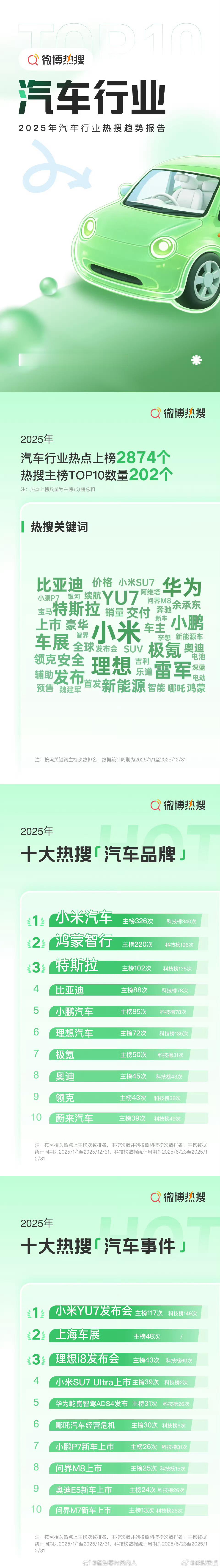 2025年微博热搜10大汽车品牌前三:小米汽车,鸿蒙智行,特斯拉