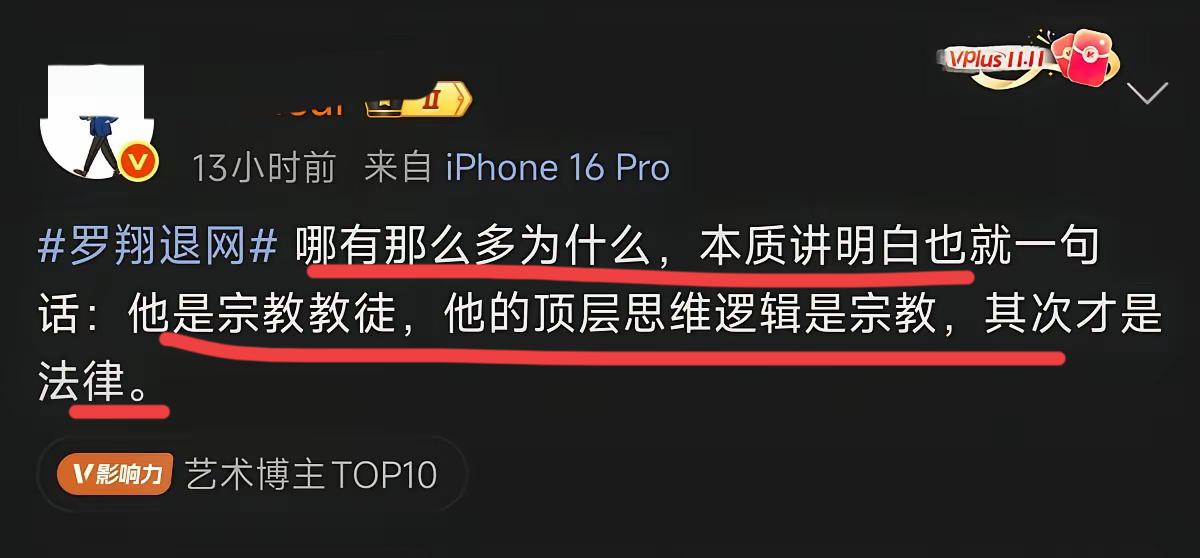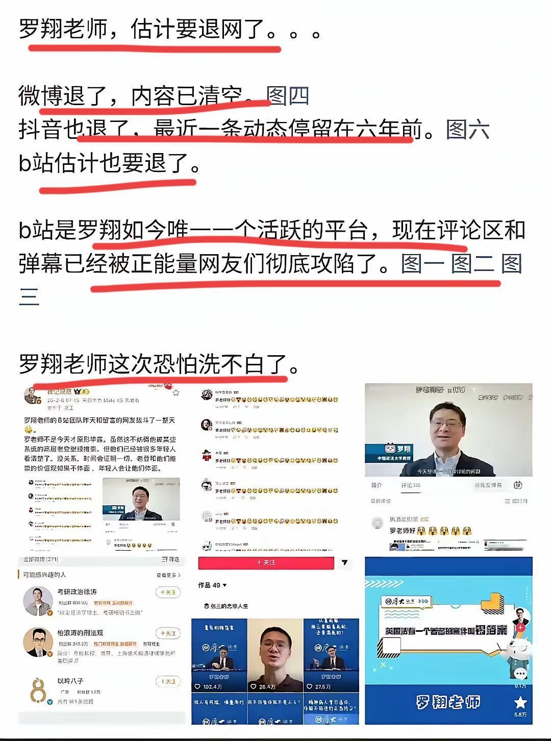 罗翔老师,彻底退网了!! 这一次,非常彻底,微博也基本清空了~ 这位法外狂徒张三创始人,被网友捧上神坛的著名法考老师,就这样就销声匿迹了,这就是生活,这就是网络,很神奇~ 一帮正能量的网友,攻陷了罗老师的评论区和弹幕,有人惊叹,这力量排山倒海,来势汹汹,罗老师这回恐怕无力回天,难以自证清白了~更有艺术博主给罗翔扣上一顶大帽子,他的顶层是教徒,其次才是法律! 见识了什么是下黑手,落井下石了吧,这就是!你怎么看罗翔事件,有何高见?