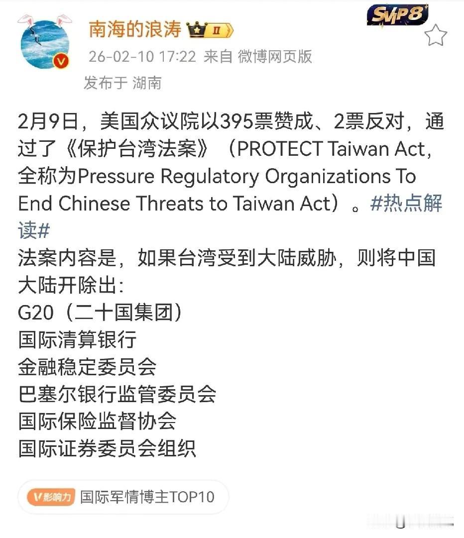 美国众议院通过了这个法案,本质上就是吓唬人的,里面没有提到任何军事的影子,只是用开除国际组织,经济制裁,这种虚头巴脑的措施来打压。 就像一位网友所说的,这真的是太可怕了,被这几个组织开除以后可怎么活,能不能现在就执行,是不是不用缴会费了,其他成员答不答应,如果答应了这些成员以后和谁做生意?