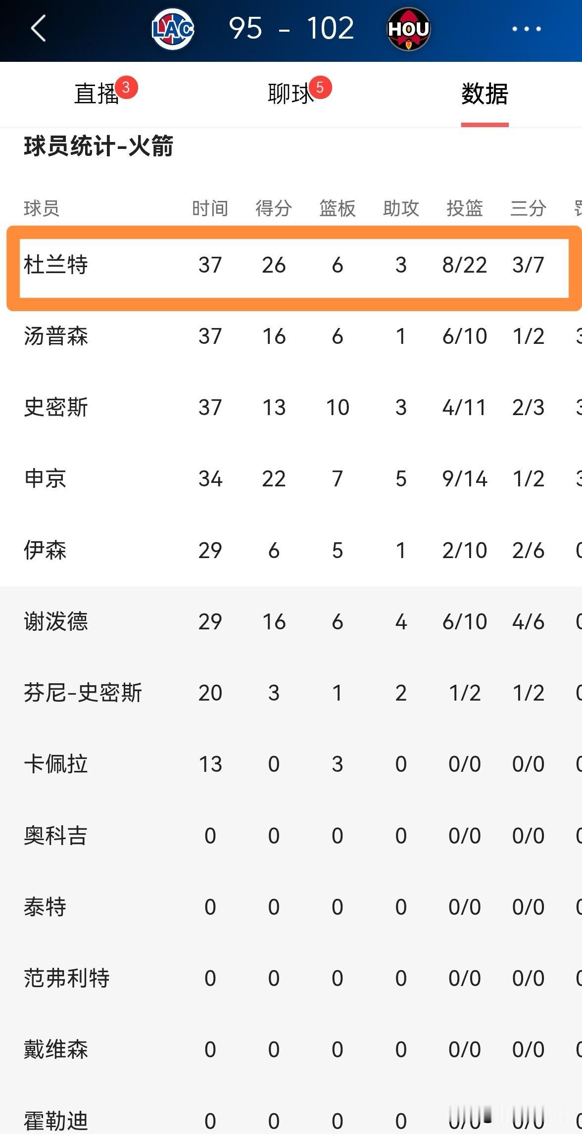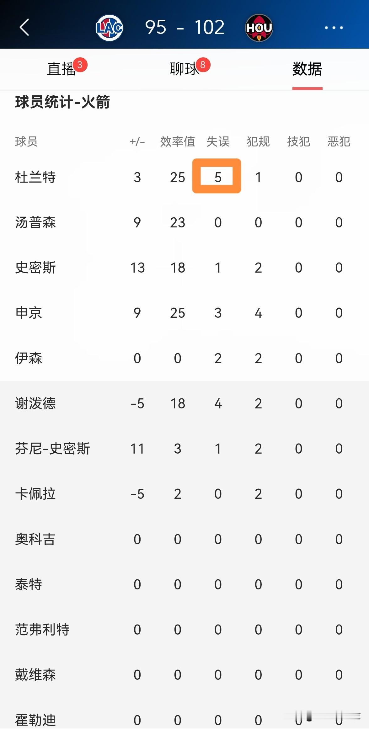 火箭巨星杜兰特的失误真是多的离谱!虽然今天火箭在主场以102:95击败快船,但是杜兰特却出现了多达5次的失误,真的是失误连连让人不忍直视。 全场比赛下来,杜兰特首发出战37分钟,投篮22中8,其中三分球7中3、罚球7中7得到26分6篮板3助攻3抢断,还有5次失误。 作为火箭的当家球星和绝对核心,杜兰特出现如此多的失误真是太不应该了,杜兰特必须提高自己破解包夹防守的能力才行。