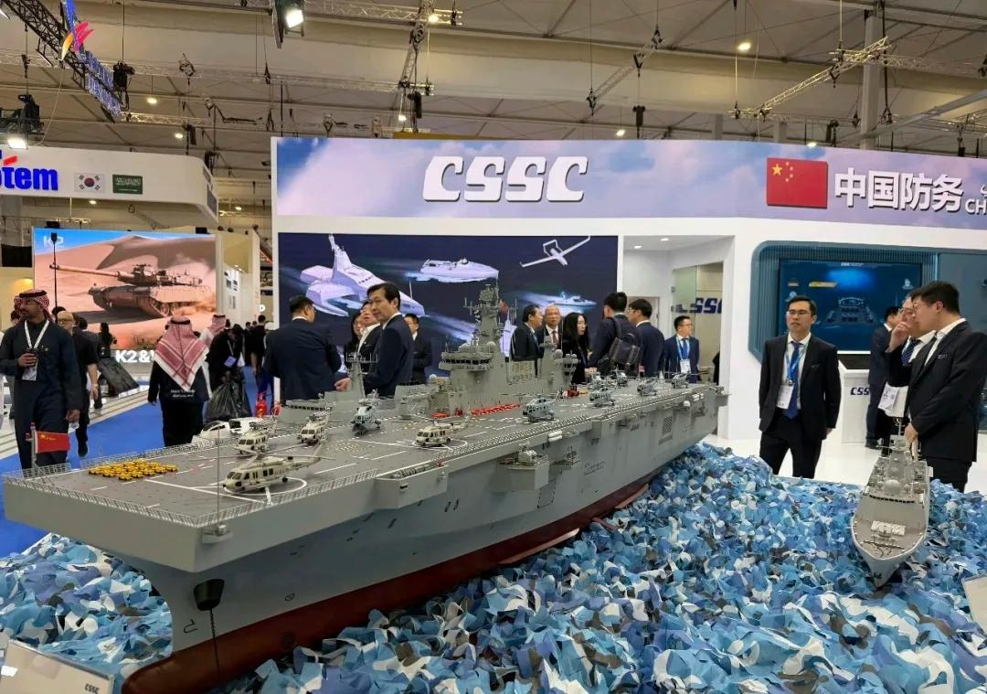 这是在2026年2月沙特利雅得世界防务展上,中国首次公开推出的075E外贸版两栖攻击舰,并在沙特展厅正式开售。 075E是基于现役075型的外贸版,是中国出口的首款4万吨级两栖攻击舰,拥有直通甲板+大型坞舱,可以搭载气垫登陆艇、两栖战车、陆战队、15–20架直升机,包括直-8 直9 直20系列。可以看做是海上移动堡垒+两栖指挥中心+轻型航母级的平台。 我们此举就是要打破垄断,此前大型两栖舰市场被美国黄蜂级、美国级,法国西北风垄断,中国推出的075E提供了高性价比新选择,价格只有西方同类的60–70%。 中国军工这次可是种类繁多,展示了一套以075E为核心的完整的“准航母战斗群”体系,还包括: 071E型两栖船坞登陆舰 052DE型驱逐舰 054AP护卫舰 056E型护卫舰 还有配套的潜艇、直升机以及指挥系统。 这种“一站式采购” 的模式,能大幅度降低用户的集成成本和后勤复杂度。中国拥有完整且自主的国防工业链,能保证从建造到后期维护、装备升级的全程可控,避免了因外部供应链中断带来的风险。 对于国际市场上客户而言,我们为众多中等海军强国,特别是中东、北非、东南亚等地区国家,提供了一个不受政治条件限制,还能显著提升其海军两栖战力和远海行动能力的高端装备选项。