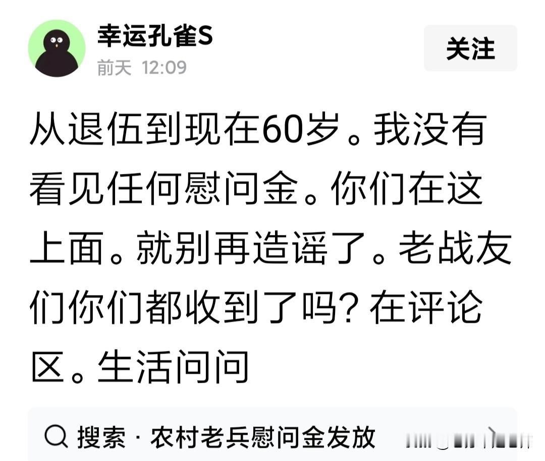 不就是一个春节慰问金吗,有必要造谣吗? 我们这里,春节不仅对60岁以上退役军人发慰问金,还对60岁以上的老党员走访慰问,并送上慰问金。 昨天,账户里收到退役军人慰问金300元。今天,我没在家(某企业保安岗位值班),12岁的孙子用她奶奶的手机发来微信,说:爷爷,今天村里人来给你送红包了。 这个红包,是村干部春节走访慰问60岁以上老党员的。我们这里,60以上退役军人,每年两节(八一,春节)都有慰问金。 如果你既是60岁以上退伍军人,又是党员的话,那春节可以收到两份慰问金,即退役军人慰问金300元党员慰问金200元。