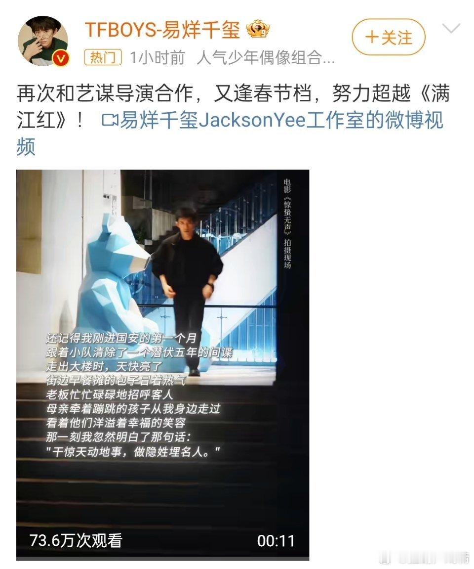 易烊千玺 努力超越满江红不感相信是他本人发的,很突然,很震惊,很无奈,满江红票房30多亿,一番是沈腾