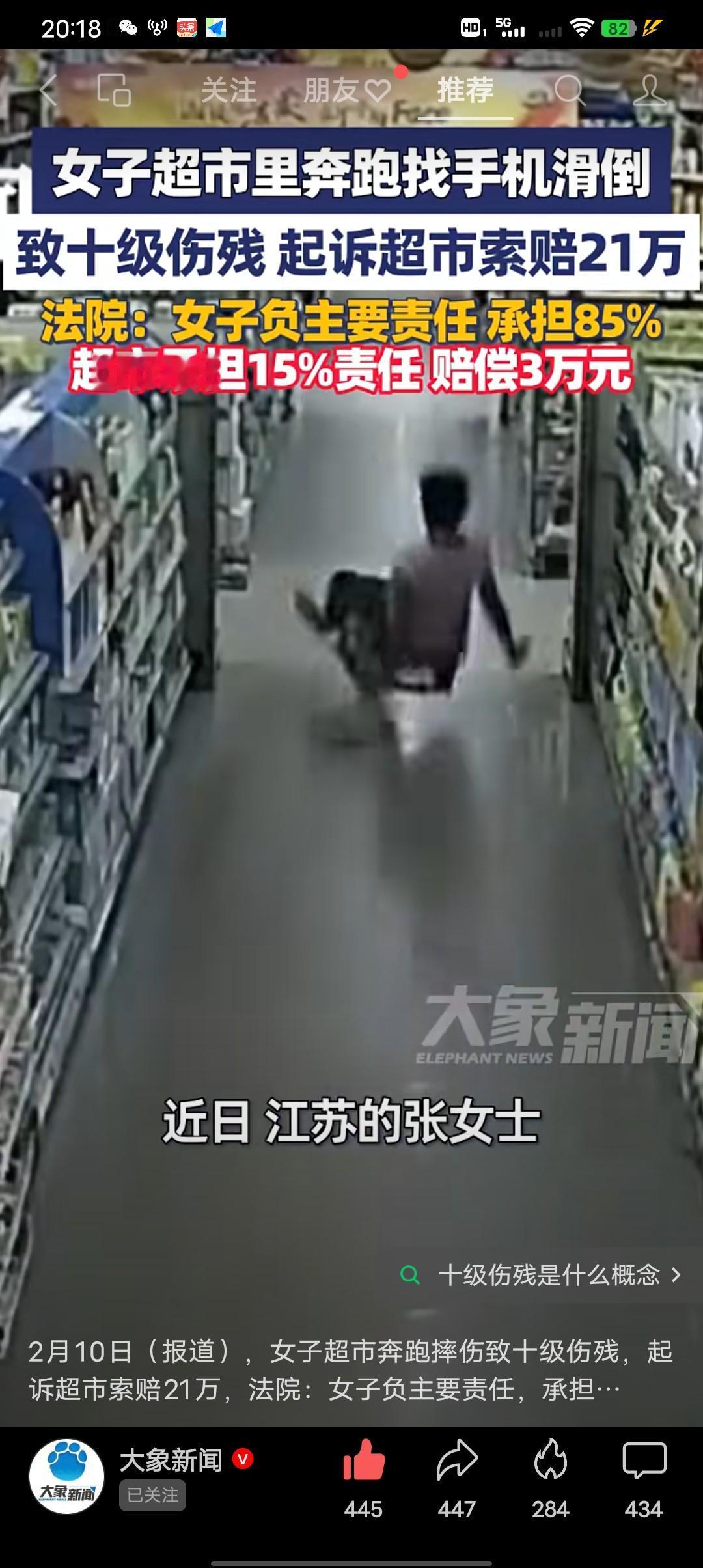 你说这个超市赔偿3万块钱冤不冤? 女子超市奔跑找手机滑倒,致十级伤残索赔21万元。近日江苏的张女士带孙子逛超市,手机忘在了水果区,跑着去拿手机的时候不小心摔倒,胸12椎体压缩性骨折,导致十级伤残。 张女士认为超市地滑,而且没有警示标志,起诉超市索赔21万元。超市辩称“地面并不湿滑”而且还提供了事发时的监控。 法院审理认为:张女士作为成年人,对公共场所奔跑没尽注意义务,负主要责任,超市监控提供不完整,无法证明尽到保障安全义务,存在管理有瑕疵,法院最终判决:张女士自行承担85%责任,超市承担15%责任,超市赔偿张女士3万多元。 有网友说,妈呀,这要是在马路上摔倒,是不是得告修马路的?还有人说这位女士告错人了,应该告鞋厂鞋底不防滑,地砖场的也有责任,他们的地砖不防滑产品有问题。 有网友说这个世界到底怎么了?自己出事摔倒难到自己身上找原因,第一时间想到的就是要讹点钱,开个超市也太难了。