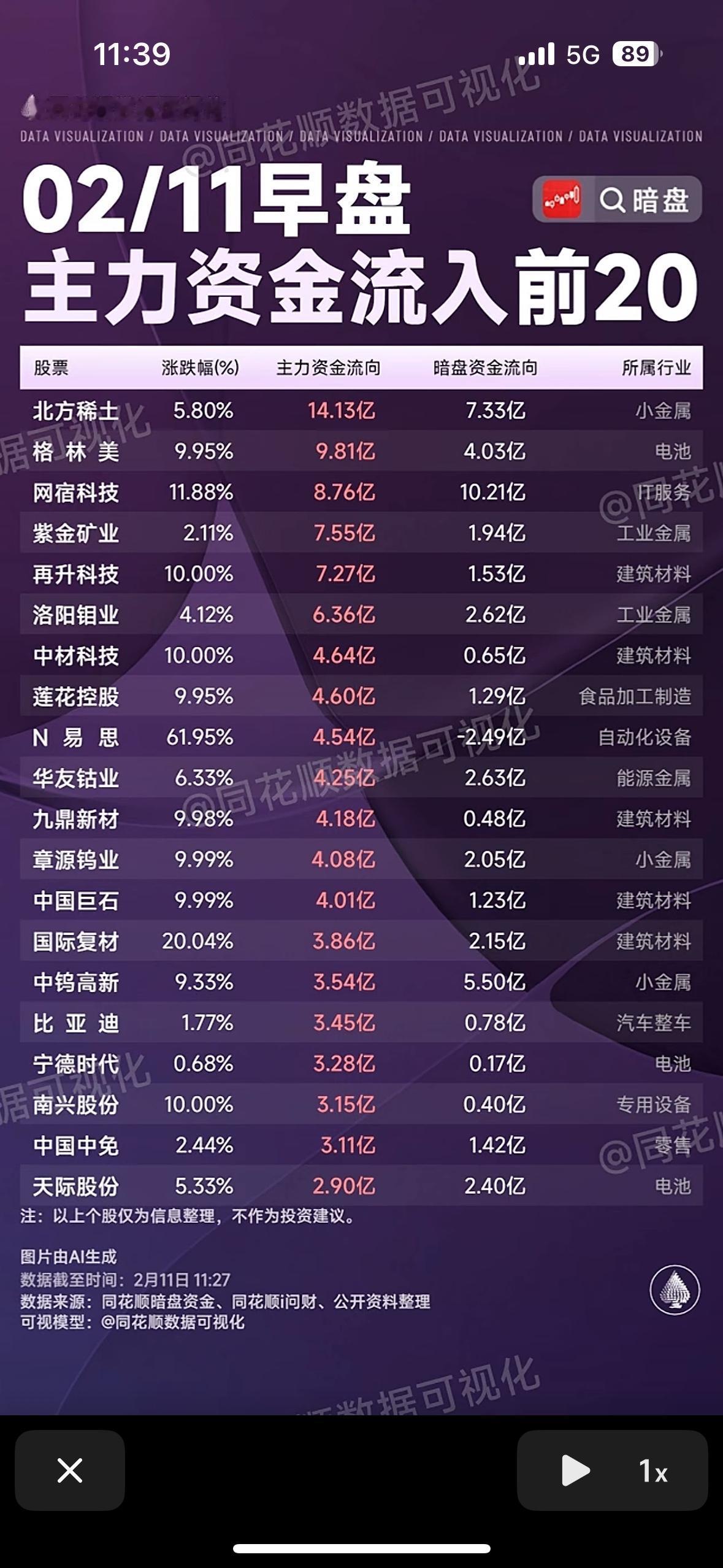 2月11日早盘主力资金流入前20股,速来围观!🔥📈 早盘主力资金流入个股一览,北方稀土、格林美等领涨,行业分布广泛,数据仅供参考。