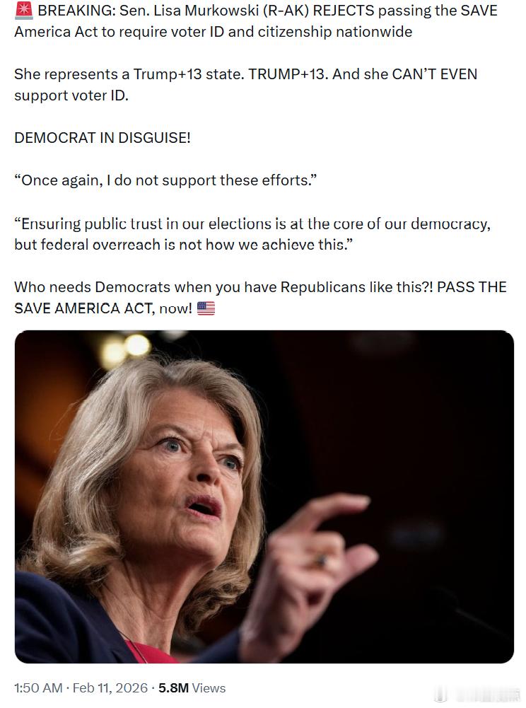 共和党参议员丽莎·默科斯基拒绝推动《拯救美国法案》,要求全美范围内实施选民身份证和公民身份验证。