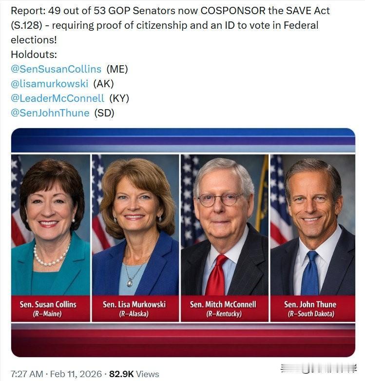 报告: 53名共和党参议员中已有49人共同发起SAVE法案(S.128号法案)——该法案要求在联邦选举中提供公民身份证明和身份证件才能投票! 尚未加入的参议员: @SenSusanCollins(缅因州) @lisamurkowski(阿拉斯加州) @LeaderMcConnell(肯塔基州) @SenJohnThune(南达科他州)