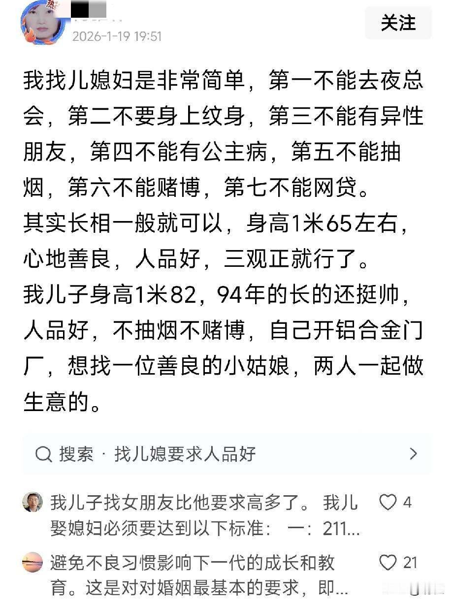你这找儿媳妇的条件可不简单!乍一看,我以为你家是啥门庭?你儿子是啥优秀的人? 符合你七个条件的女孩绝对没有,符合你第四个条件的女孩很多,除了第四个条件之前,符合你儿媳妇条件的极少。 要求女方不能有异性朋友,请问你能先管住你儿子吗?这年月,别说年轻人,就我们这五十多岁的人也不见得没有一个异性朋友吧!还不能有公主病,那你儿子有没有少爷病?真的是看自己啥都好,看别人啥都不行。 要我说你儿子就该打光棍!不是你儿子不好,是有你这样的父母。