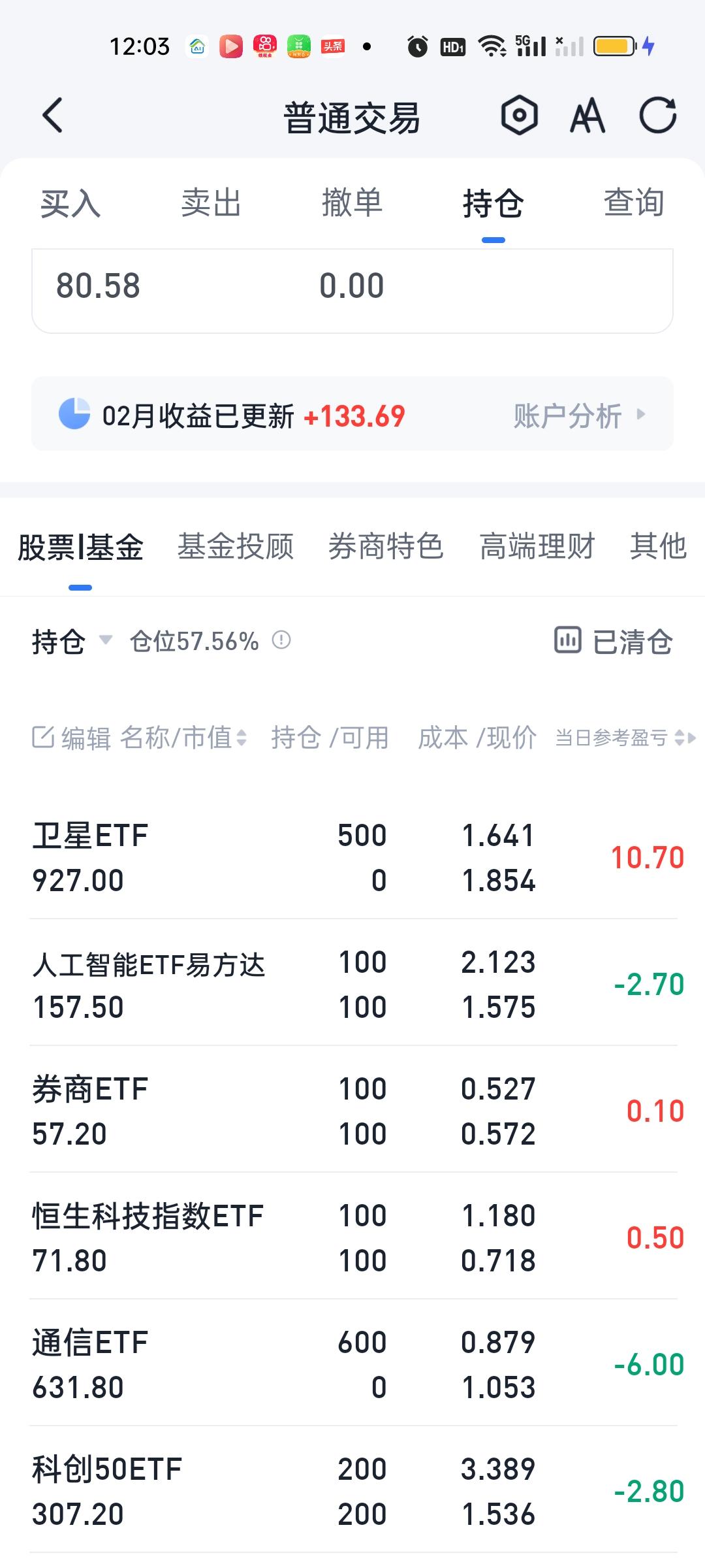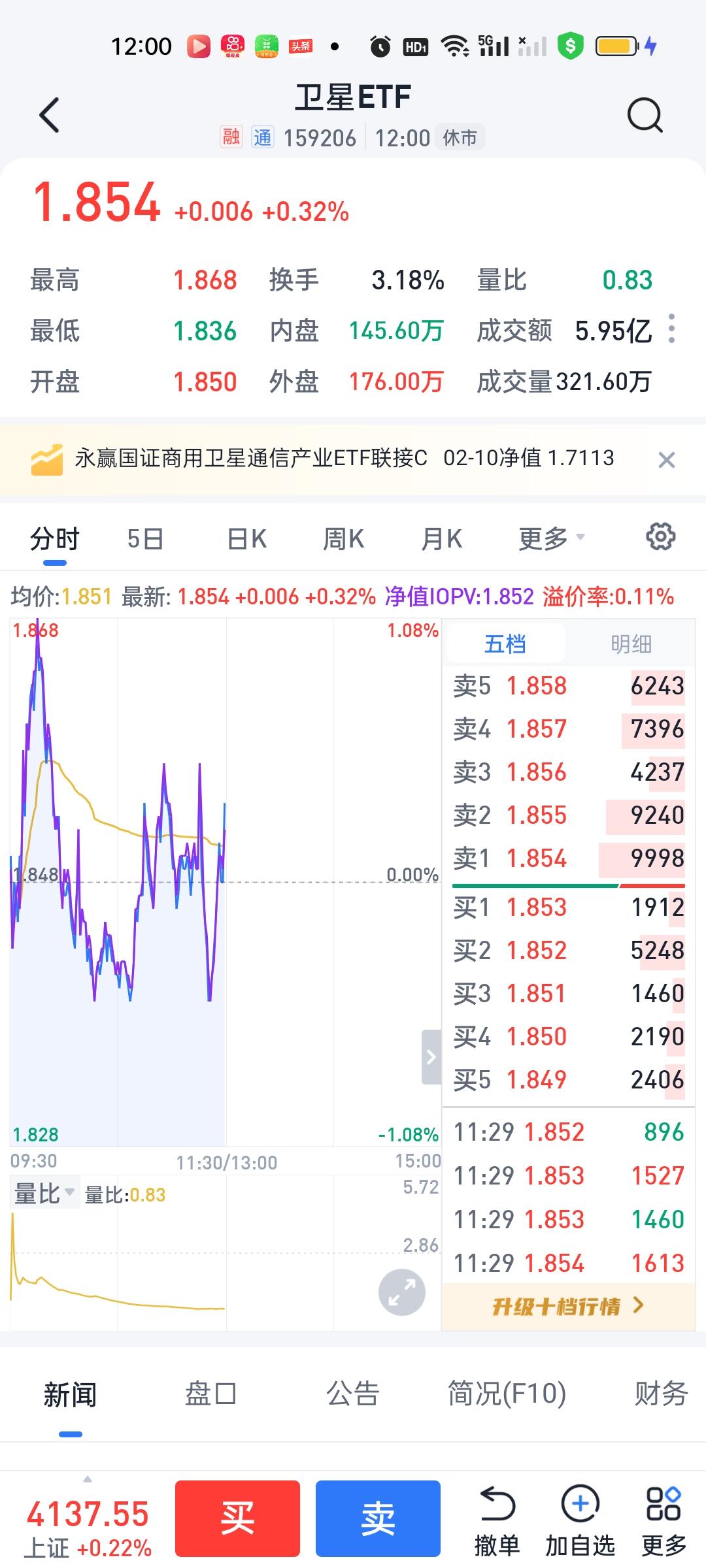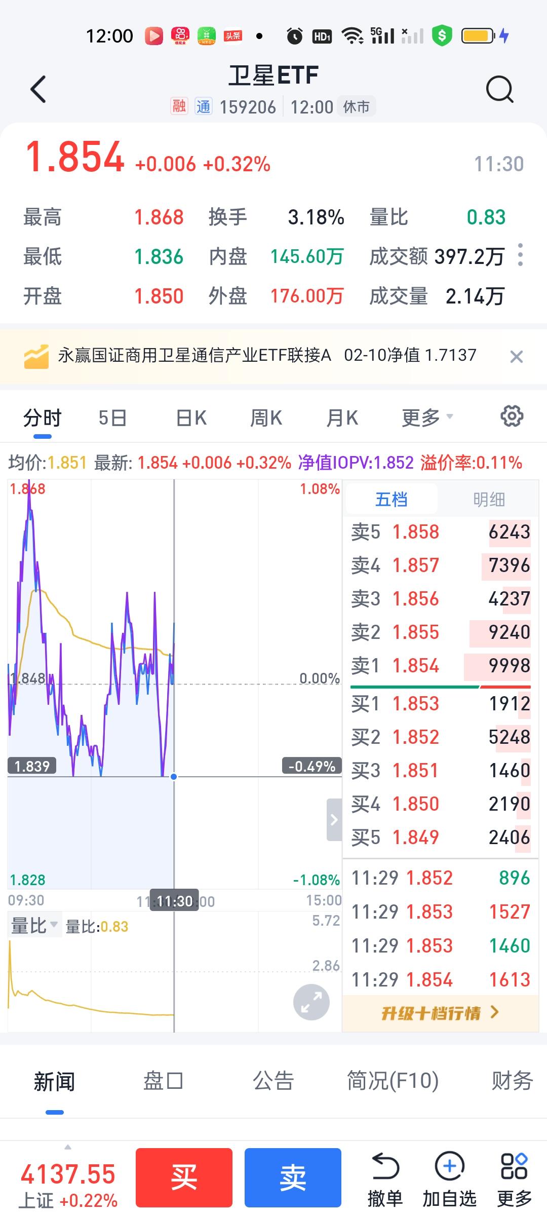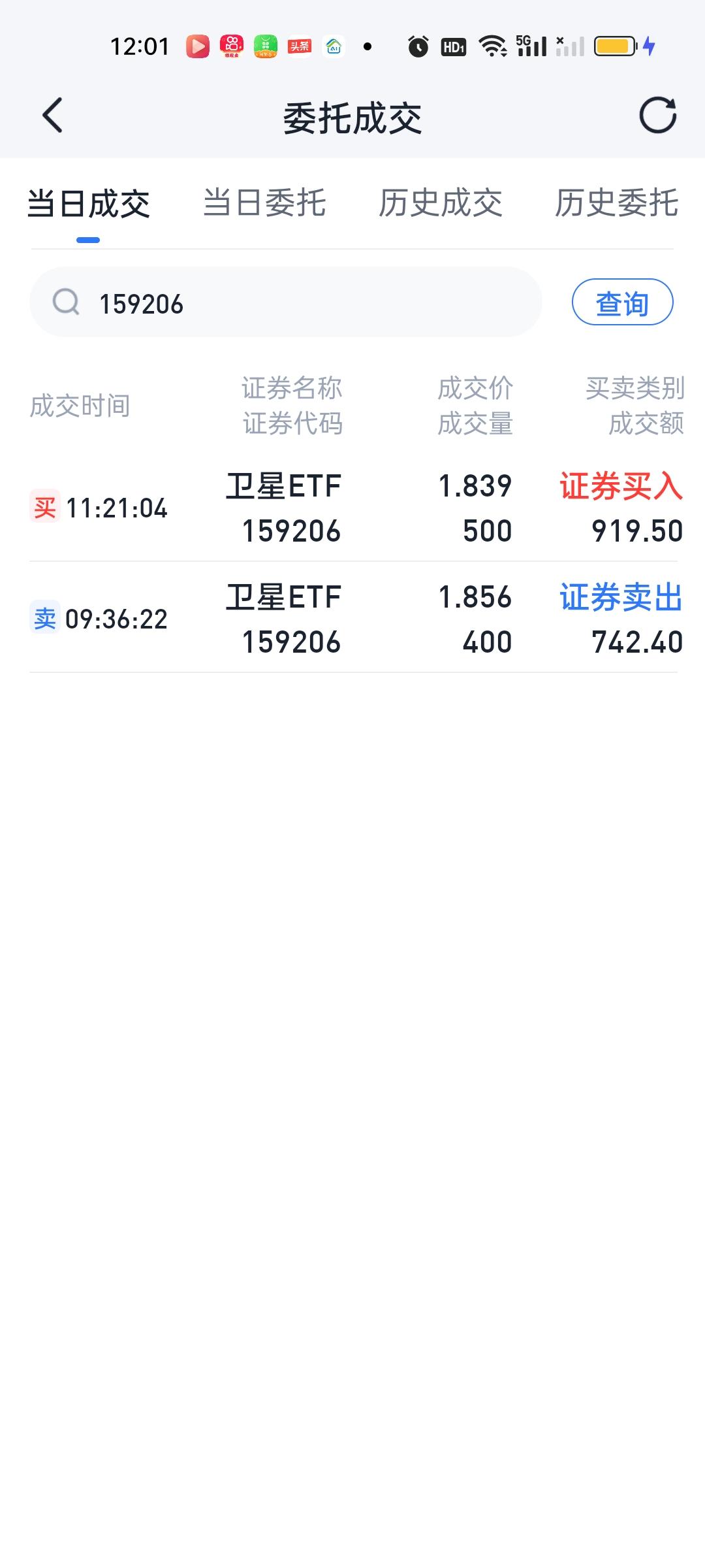 前面我就说过我会选择持币过节,我是这么说的也是这么做的。所以现在不管是场内证券账户还是场外账户我的仓位都十分低了。上午收盘证券账户不亏不赚。 今天对卫星ETF的操作算是比较精准啊,1.839居然成功守到了,这就是运气。卫星ETF上午波动只有32个基点,实际上也没有足够的操作空间,根本就不需要操作,我就是手痒找找感觉,大家不要学我。一般情况下每天有100个基点的波动做做T会很舒服。30个点左右的窄幅震荡真的没有操作的必要!