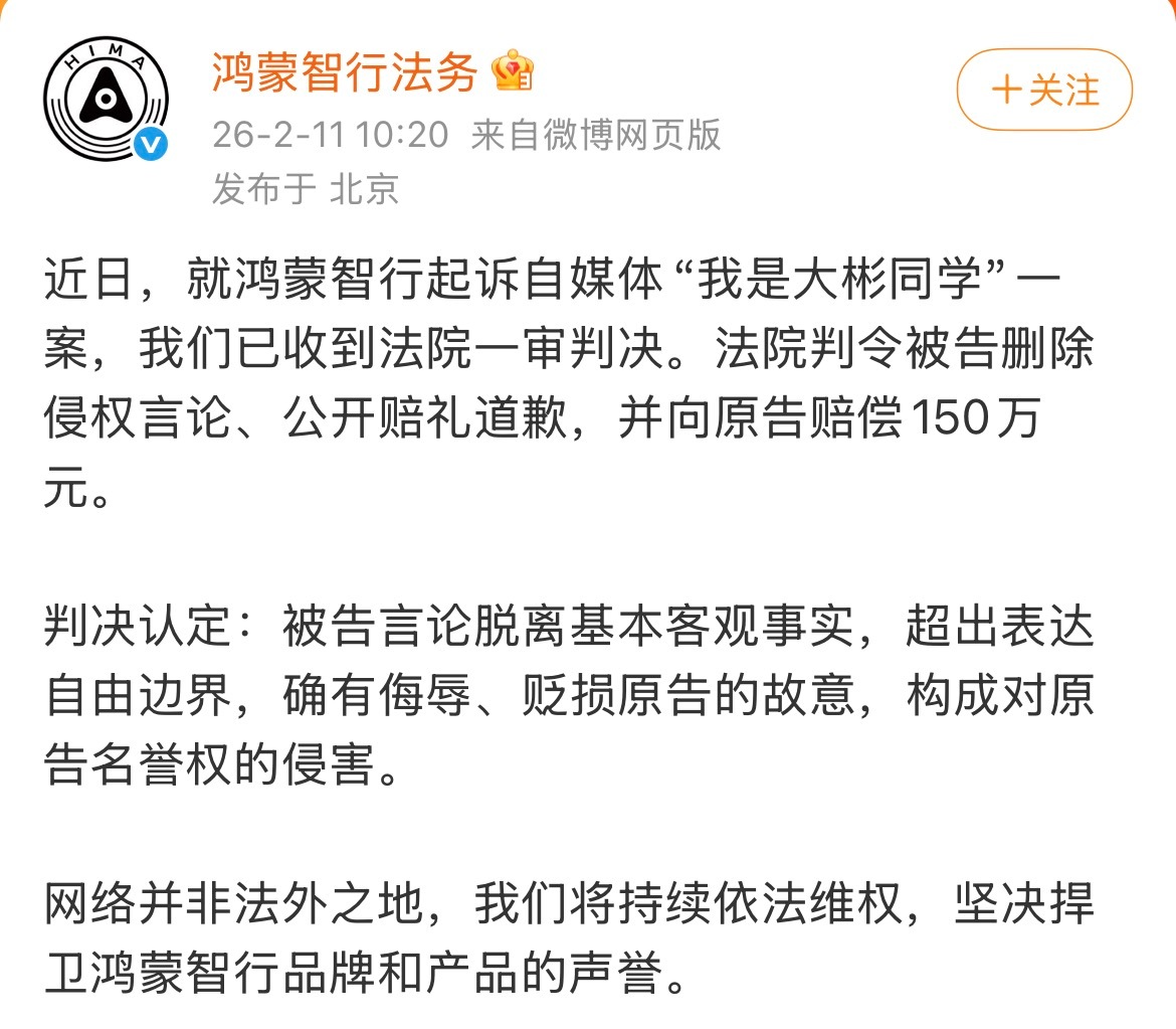 我是大彬同学被判赔鸿蒙智行150万,还有人说大彬同学是富二代,快过年了,不知道大彬同学心情如何。