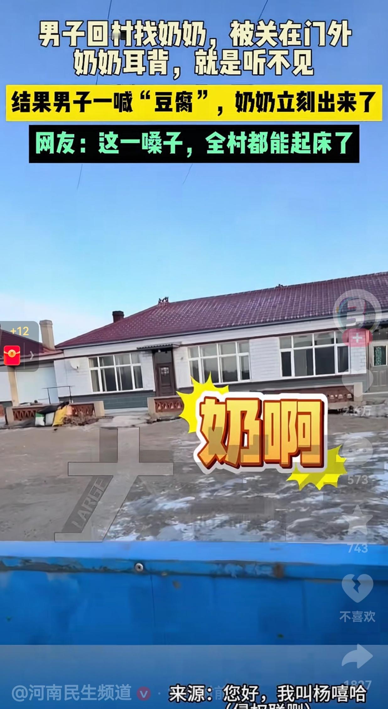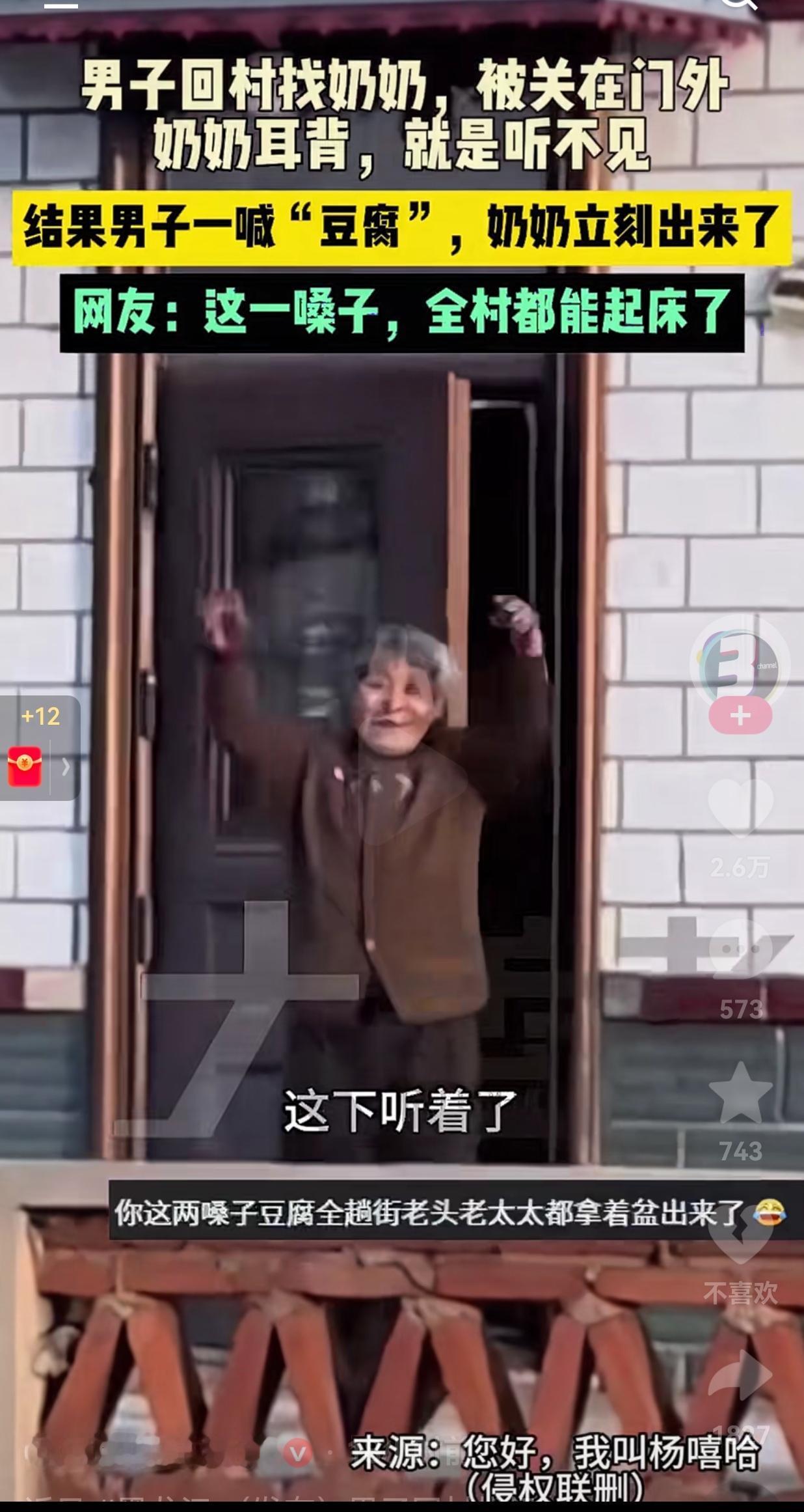 笑完直接泪崩!喊奶奶听不见,一喊豆腐立马冲出来:这才是最戳心的人间真实。 近日,黑龙江一小伙回村看奶奶,由于起得太早了,等小伙到奶奶家时,家里大门还没开,直接被关在了门外。 小伙无奈吐槽:回农村真的不能起太早啊! 他站在门外连着喊了好几声“奶奶”,可年纪大了耳背的奶奶,在屋里一点动静都没听见,半天没人开门。 小伙灵机一动,突然扯着嗓子大喊了两声:“豆腐!豆腐!” 谁知道这一嗓子刚落,下一秒奶奶就笑着从屋里快步跑了出来,还乐呵呵念叨着:这下听着了! 就这么短短十几秒的视频,一发到网上,瞬间戳中了几百万网友的心,评论区直接炸了。有人笑着说:你这两嗓子豆腐,全村老头老太太都得拿着盆冲出来! 还有人说:这哪是喊豆腐,这是喊醒了奶奶一辈子的习惯啊! 我想,奶奶不是听不见孙子喊她,是奶奶这两个字,天天听,习以为常;可豆腐这两个字,是她听了一辈子、记了一辈子的声音。 在她们那个年代,没有外卖,没有超市送货上门,村口一声“卖豆腐咯”,就是家里能添菜、能解馋、能给孙子孙女改善伙食的信号。 那声豆腐,是柴米油盐的踏实,是省吃俭用的温柔,是刻在骨子里的生活习惯,更是藏了大半辈子的牵挂。 我们总笑老人“选择性耳背”,喊啥都不理,一听见买菜、买东西、占便宜就精神。 可我们忘了,她们一辈子都在为家里精打细算,一辈子都在为儿女、为孙辈操心,那些我们觉得不起眼的吆喝声,早已融进了她们的岁月里,比任何话都听得真切。 现在我们长大了,走得远了,见得世面多了,可家里的老人,还停留在她们最熟悉的时光里。 她们耳背了,眼花了,跟不上我们的节奏了,可那些为了家人养成的习惯,却一辈子都改不了。 你喊她,她可能听不清。你喊一声她惦记了一辈子的“生活”,她比谁都跑得快。 我们总忙着赚钱,忙着赶路,却忘了多回头看看那个慢慢老去的人。 所以,有空多回家看看老人,他们年纪大了。说句不好听的,她们真的是活一天少一天,别因为太忙,忽略了身边的亲人,给自己留下遗憾。 大家觉得呢?欢迎大家评论区讨论留言。