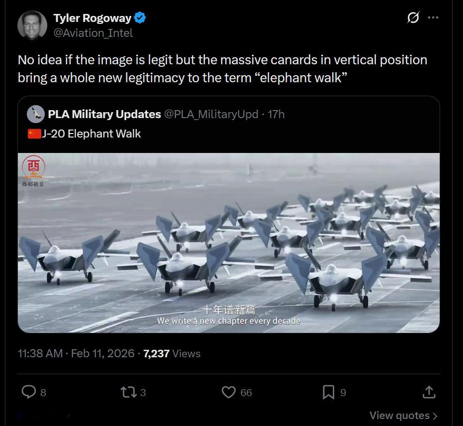 War Zone的主编Tyler Rogoway吐槽说,歼20在鸭翼向上的情况下,才是字面意义上的“大象漫步”。“大象耳朵大”。