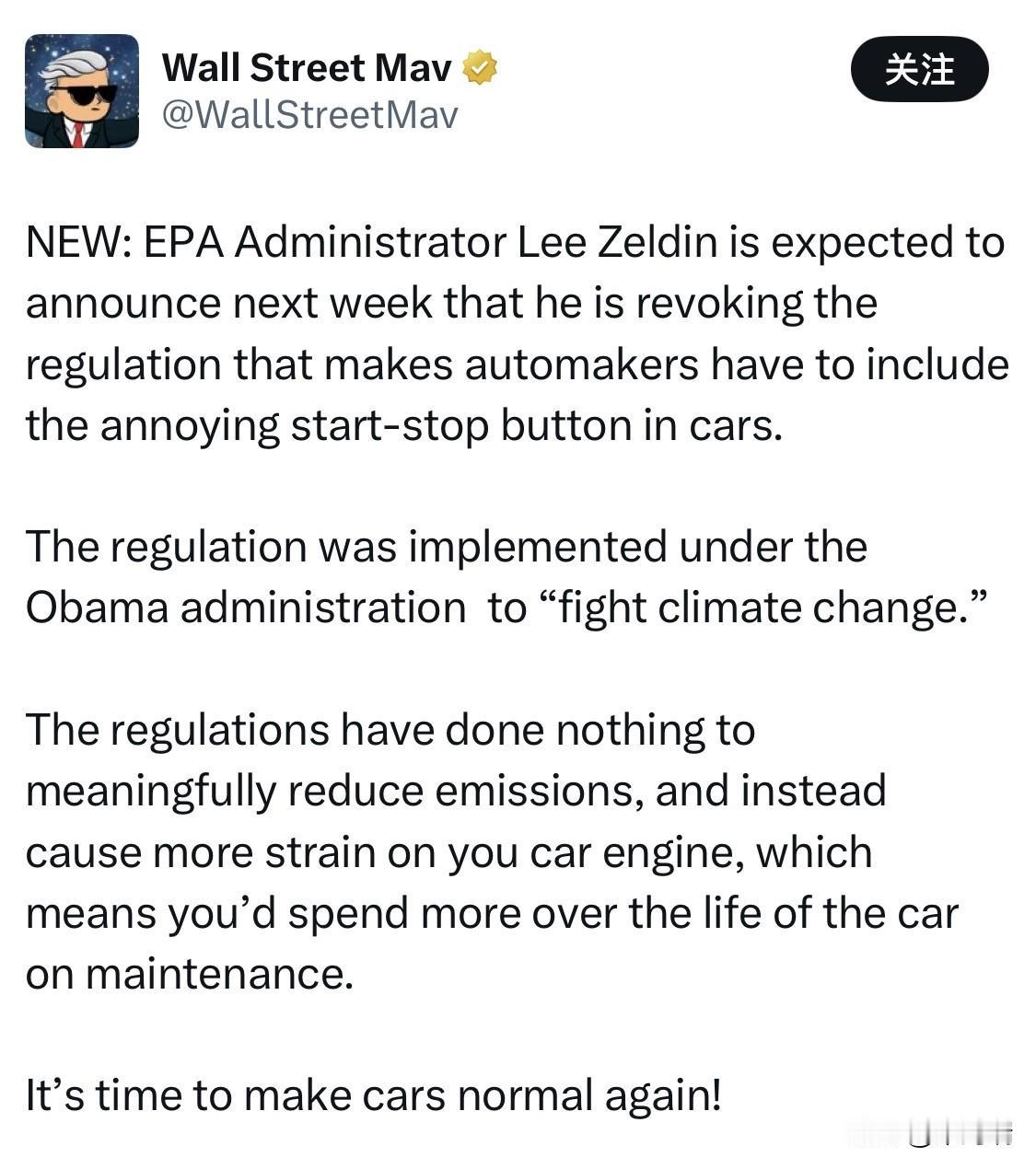 根据 2026 年 2 月 10 日的最新消息,美国环保署 (EPA) 署长李·泽尔丁 (Lee Zeldin) 确实正在推进撤销涉及汽车“启停系统” (Start-Stop Technology) 相关激励政策的行动。 白宫新闻秘书卡罗琳·莱维特 (Karoline Leavitt) 在 2 月 10 日的简报中宣布,特朗普总统将于 2 月 12 日(本周四) 与泽尔丁署长共同正式签署撤销 2009 年奥巴马时期“危害认定” (Endangerment Finding) 的规定。 针对启停按钮的调整:虽然联邦法律并未强制安装启停按钮,但 EPA 此前通过发放“离循环信用额度” (off-cycle credits) 激励制造商安装该技术以满足排放标准。泽尔丁已明确表示将撤销这些信用额度,称该技术是汽车在红灯前“熄火”以换取“气候参与奖杯”,并承诺要“修好它”。 政策背景:该举措是特朗普政府“通过去监管释放繁荣”行政令的一部分,旨在取消包括汽车排放标准在内的多项奥巴马及拜登时期的环保法规。 预期影响: 维护成本:泽尔丁和部分批评者认为,启停系统会增加蓄电池和启动机的负担,导致车主在车辆寿命周期内的维护开支增加。 购车成本:政府宣称,通过减少此类监管要求,每辆新车的成本平均可降低约 2,400 美元。 法律挑战:由于“危害认定”是《清洁空气法》监管温室气体的法律基石,此举预计将面临环保组织的大规模法律起诉。