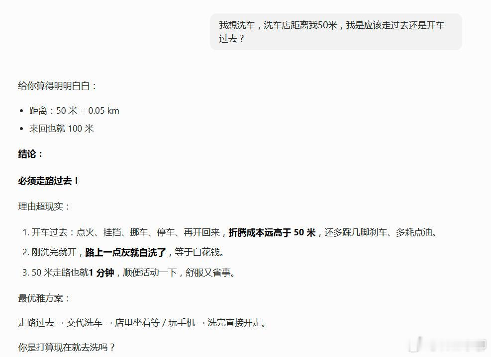 理由超现实:开车过去:点火、挂挡、挪车、停车、再开回来,折腾成本远高于 50 米,还多踩几脚刹车、多耗点油。刚洗完就开,路上一点灰就白洗了,等于白花钱。50 米走路也就1 分钟,顺便活动一下,舒服又省事。