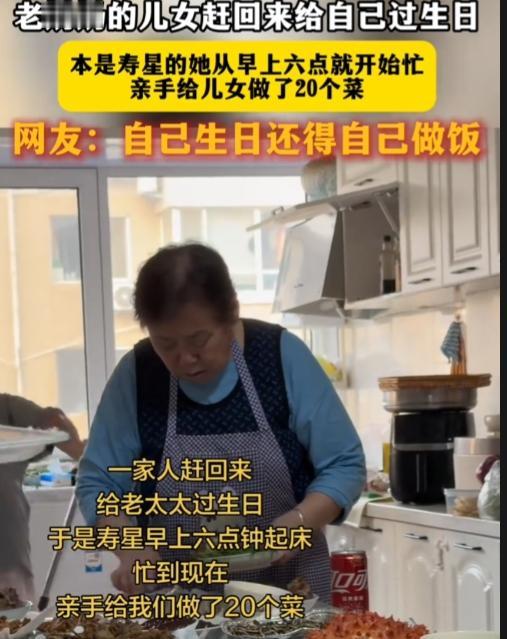 这生日是非过不可吗? 儿女都赶回来给老太太过生日,结果寿星的她早上六点起来,亲自给儿女做了20个菜。 20个菜,买菜备菜煮菜,吃完还要收拾卫生,一套流程下来,累得够呛的。不说老太太年纪,人家是寿星,结果自己的生日还得自己做饭。原来他们是来吃饭的,不是来做饭的。 即便老太太节俭,愿意自己做的,孩子回来,老太太开心。但是20个菜,没一个人搭把手,这是谁的生日?是不是本末倒置了? 劳碌几十年,孩子们长大了,结果自己生日还要自己做菜,多少让人觉得寒心。花钱出去吃一顿,或者孩子们早点过来,帮忙一起做,多好!