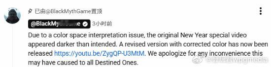 《黑神话:钟馗》国外播片出问题,游戏科学致歉日前,游戏科学发布了《黑神话:钟馗》贺岁小短片,祝大家在马年,食能知味,寝能安睡!然而让人没想到的是,游科国外播片整出了茬子——贺岁短片亮度“漆黑无比”。随后游戏科学在官方账号也进行了内容的换源,并发布了致歉公告:“由于色彩空间问题,此前发布的新年特别视频画面比预期效果偏暗。该问题已在此版本中修复。我们为此可能给各位天命人带来的不便深表歉意。”