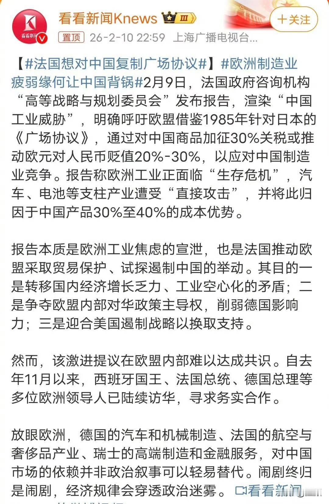 法国高等战略与规划委员会居然喊出:对中国商品加征30%关税、欧元对人民币贬值20%-30%,复刻当年对付日本的套路来打压中国制造业。 这思路既无知又狂妄: 当年广场协议是美国强压日本,如今中国不是日本,欧元更没美元霸权,谁来逼中国就范? 中国制造业的成本优势,是全产业链、效率、规模堆出来的,不是靠汇率和补贴,加税只会让欧洲通胀炸锅、百姓买单、产业空心化更严重。 欧盟内部早就撕裂,德国、意大利等国靠中国市场吃饭,根本不可能陪法国玩火。美国都没做到的全面围堵,法国连上桌的资格都没有。 喊“中国工业威胁”,本质是自己不行、甩锅中国,真敢落地,先垮的是欧洲工业。 嘴炮可以,真动手,只会死得更快。