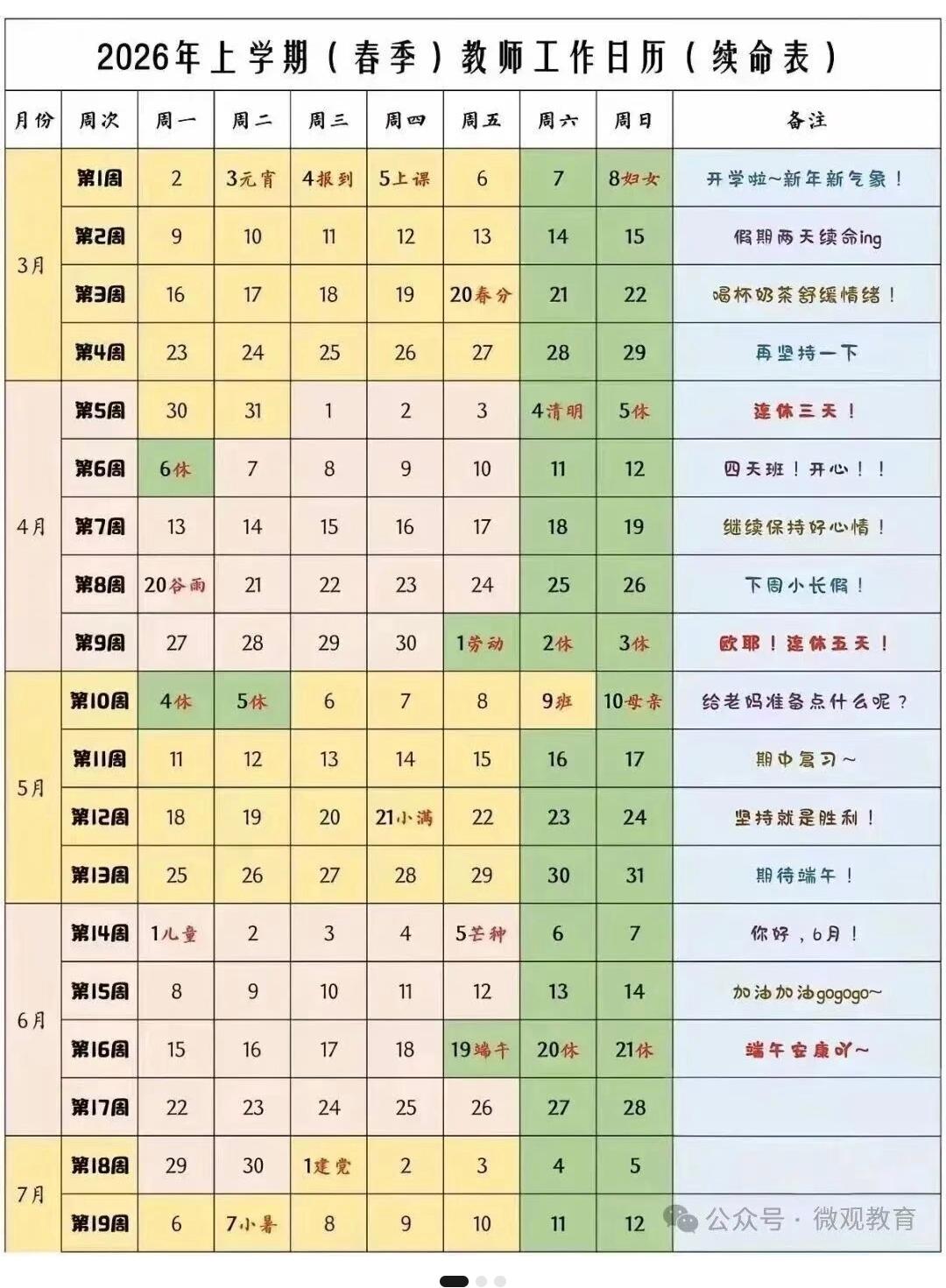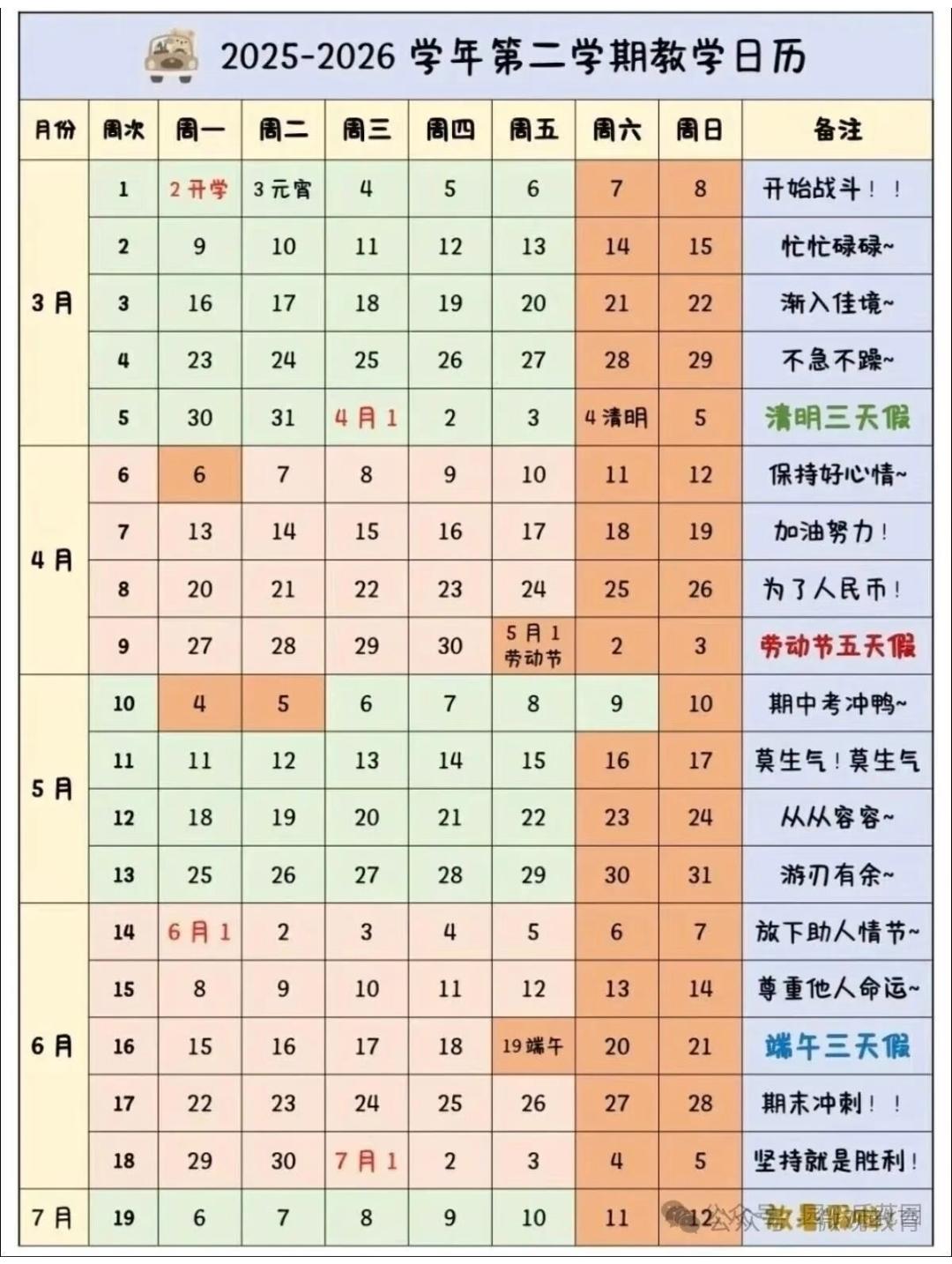 多地官宣学年度春季这是史上最短的一学期 分月安排(月月有假) 3月:上课20天,休11天(含元宵节) 4月:上课21天,休9天(含清明节)某地额外 春假3天 5月:上课19天,休12天(含劳动节) 6月:上课21天,休9天(含端午节) 各年级冲刺节奏: 高三:仅剩63天冲刺 初三:只剩72天拼搏 其他年级:上课仅约84天!! 新学期,请全力奔跑!