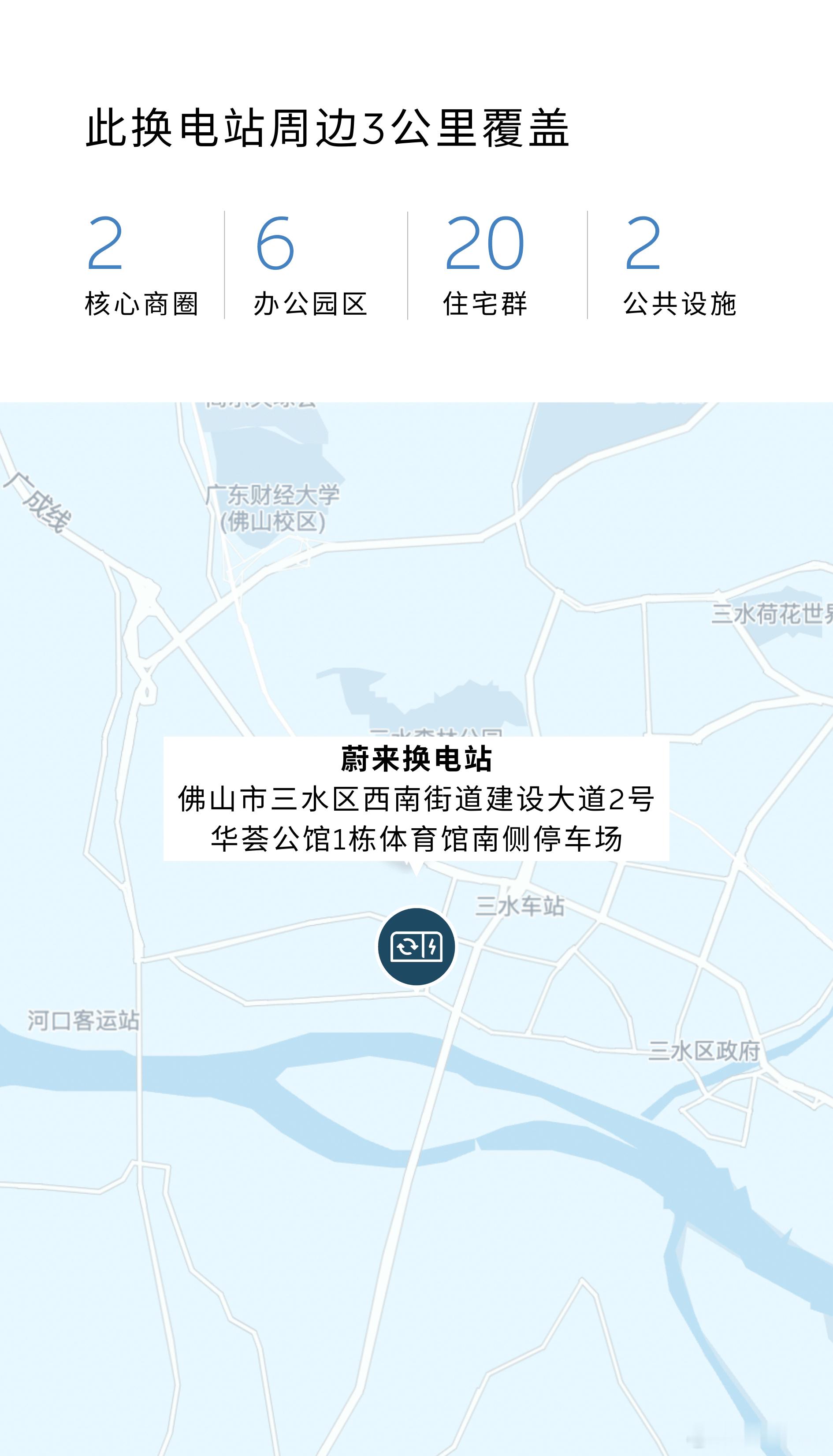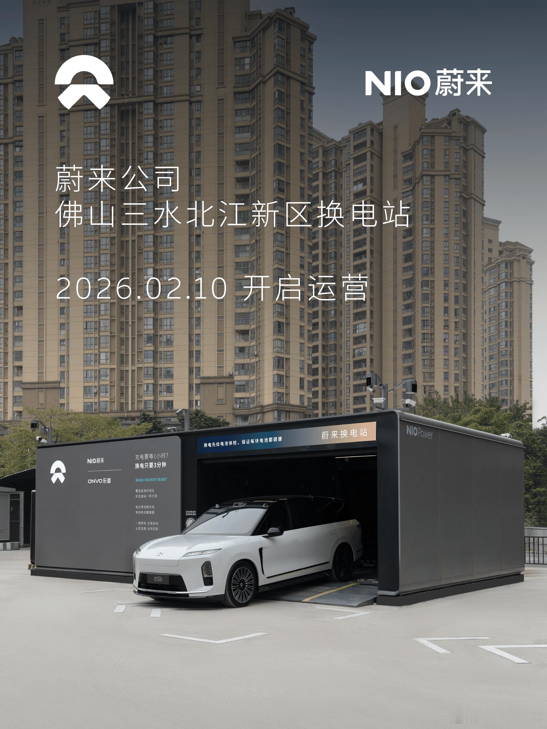 蔚来换电站 | 佛山三水北江新区 上线周边3公里覆盖2大核心商圈、6大办公园区、20大住宅群、2大公共文化设施截至2月11日,蔚来已在广东省布局460座换电站