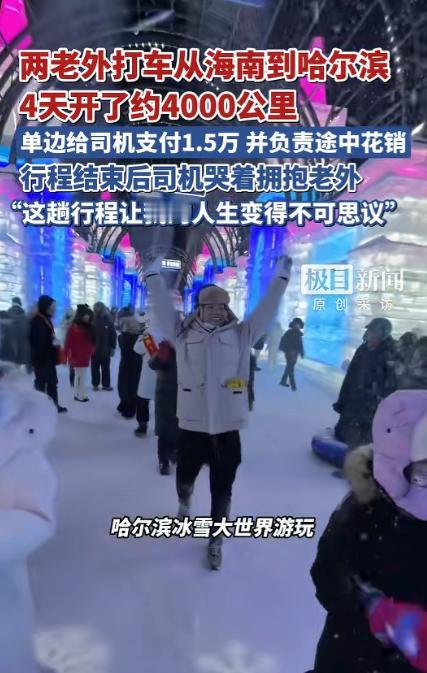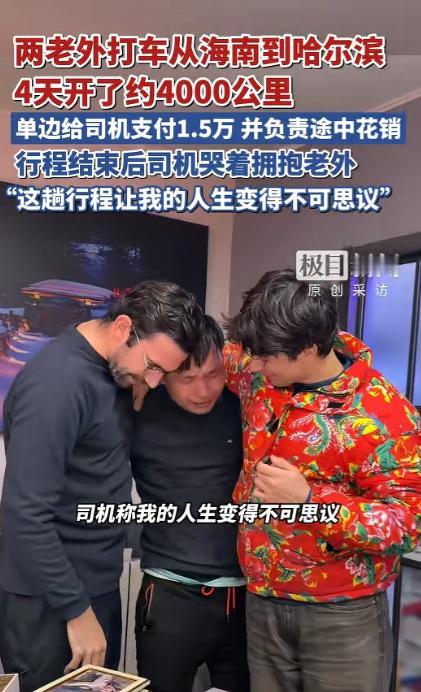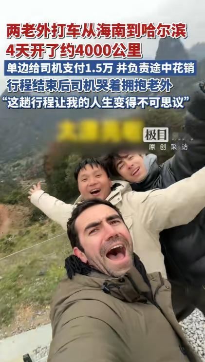 “这就是有钱任性!”近日,海南,两名外国男子,为了体验中国的风土人情,竟在软件约了个出租车司机,想要从海南开到哈尔滨,这把司机吓得不轻,不过还是同意了,就这样,三人边开边玩,最终在4天后,到达了哈尔滨!司机:我的人生变得不可思议! 这就是有钱任性!近日,海南发生了一件让不少网友直呼大开眼界的事,两名外国男子抱着沉浸式感受中国风土人情的想法。 做出了一个让人意想不到的决定,不坐飞机、不坐高铁,直接在打车软件上下了一单,目的地从海南直达哈尔滨。 常年在海南本地跑短途的司机罗师傅,平日里接触的大多是市区内的短途行程,最远也不过是周边市县。 突然接到横跨南北、里程接近 4000 公里的订单,第一反应是又惊讶又忐忑,担心对方是恶作剧,也担心长途行驶的安全与费用问题。 可让他没想到的是,两名外国友人十分爽快,不仅提前沟通好行程细节,还当场预付了 15000 元的车费。 明确表示途中所有的油费、过路费、吃住开销全部由他们承担,不会让司机有任何经济上的顾虑,这份诚意彻底打消了司机的犹豫,最终他下定决心,接下了这趟注定特别的旅程。 出发当天,司机师傅做了简单的准备,他常年生活在南方,几乎没经历过严寒,特意收拾了薄外套,可他没想到,越往北走,气温越低,这份准备远远不够。 一路上三人没有着急赶路,而是按照边走边玩的节奏前行,沿途的风景一点点发生变化,让常年囿于城市道路的司机师傅目不暇接。 这是他 39 年人生里,第一次走出生活的圈子,第一次亲眼看见课本里的山水风光,第一次真切感受到中国国土的辽阔。 每到一处有特色的地方,三人就会停下脚步,逛逛当地的街道,尝尝地道的小吃,感受最接地气的人间烟火,没有奢华的安排,却有着最真实的旅途乐趣。 行程走到中段,气温已经和海南拉开了巨大差距,南北温差接近 50 度,司机师傅穿着单薄的衣物,在寒风里冻得手脚发麻。 两名外国友人看在眼里,主动带着他去商场挑选厚实的羽绒服、保暖的棉鞋和御寒的衣物,全程主动买单,细心又周到。 旅途并非一帆风顺,行驶到半路时,车辆出现了故障,无法继续前行,本以为会耽误行程,可两名外国友人没有丝毫抱怨,第一时间联系更换车辆,全程主动处理后续事宜,不让司机师傅多操一份心,确保行程能顺利继续。 四天的时间里,车子稳稳行驶了近 4000 公里,终于抵达了目的地哈尔滨,此时的哈尔滨正处于严寒之中。 零下二十多度的气温,到处是银装素裹的冰雪景观,和出发时海南的温暖湿润形成了极致的反差,站在冰雪覆盖的街头,三人都露出了开心的笑容。 这趟行程的费用结算也十分爽快,除了去程预付的 15000 元,两名外国友人还主动支付了返程的 15000 元,全程车费总计 30000 元,途中所有的花销也都由他们承担。 考虑到司机师傅独自开车返回海南太过辛苦,两人还贴心地为他购买了返程的飞机票,等罗师傅坐飞机到桂林后。 再坐上当时损坏,目前已经修好的车辆开车回海南,这份周到与大方,让身边人都忍不住感慨,两位外国友人实在太讲究。 行程结束的那一刻,常年奔波在市井里的司机师傅再也忍不住情绪,红了眼眶,主动上前和两名外国友人紧紧拥抱,哽咽着说,这趟旅程让他 39 年的人生变得不可思议,实现了太多人生里的第一次。 第一次开出租车跑如此远的长途,第一次横跨中国南北,第一次体验近 50 度的温差变化,第一次亲眼看见不同地域的风光。 第一次和外国友人如此真诚地相处,这些从未有过的经历,像一束光,照亮了他平淡的生活,也让他对祖国的辽阔与美好有了最真切的感受。 从海南的椰风海韵到哈尔滨的冰天雪地,四天四夜,近 4000 公里的路程,这不仅仅是一次打破常规的长途打车,更是一场跨越地域与国籍的温暖相遇。 没有刻意的炒作,没有复杂的算计,只有陌生人之间的信任、真诚与善意,两名外国友人用自己的方式感受着真实的中国。 而朴实的出租车司机,也在这场意外的旅程里,收获了人生中最珍贵的新鲜体验,这份简单又纯粹的美好,也让这趟长途旅程,成为了一段让人津津乐道的温暖故事。 对于这件事,您有什么想说的吗?欢迎评论区留言讨论。 信源:极目新闻2026-02-10——《两老外打车从海南到哈尔滨,4天开了约4000公里,单边给司机支付1.5万并负责途中花销……》