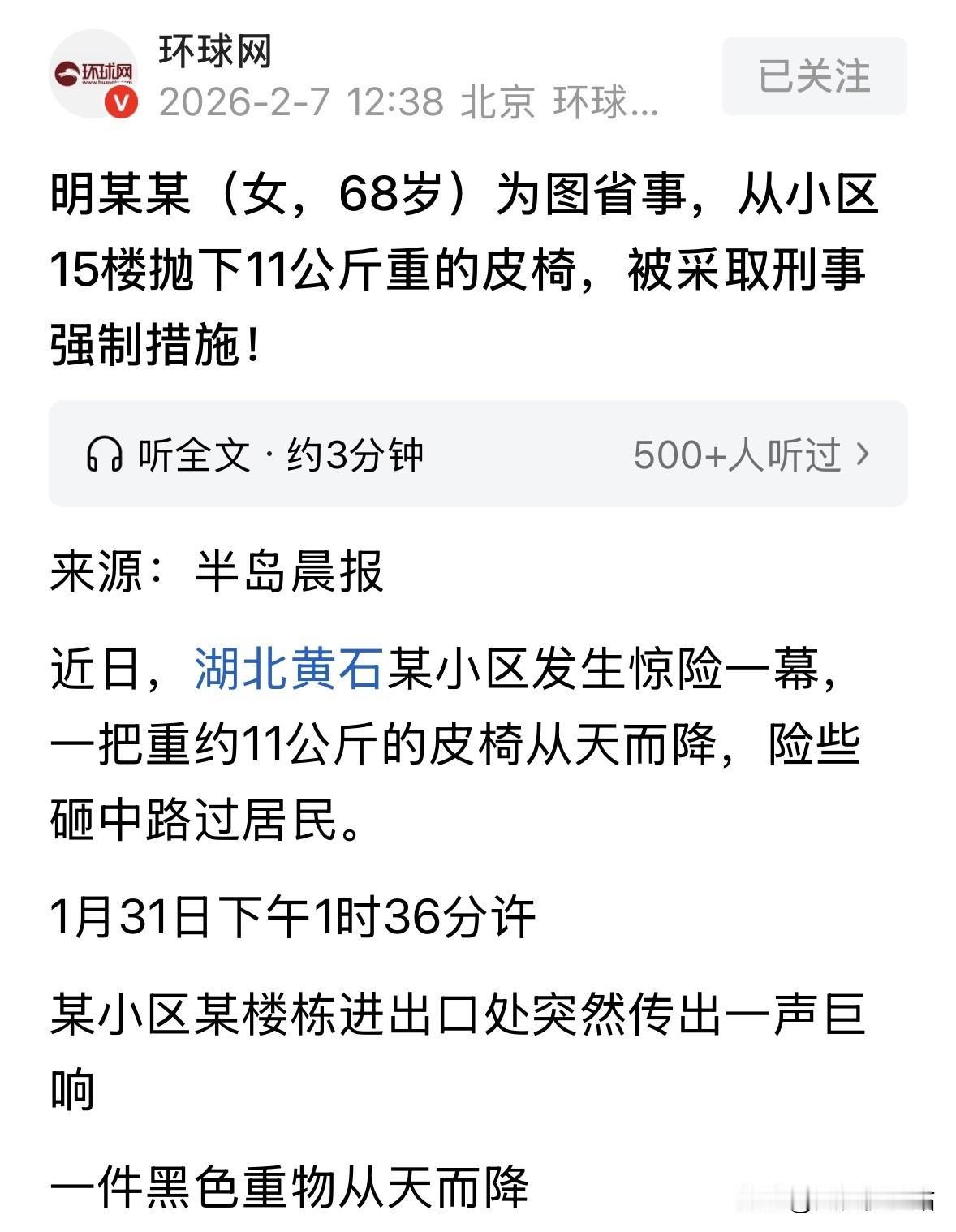 “坏人变老了!”湖北黄石,68岁大妈懒得下楼一趟,就把一个重达11公斤的皮椅,从15楼扔了下去,一名老人带着孩子恰好经过,离皮椅砸下来的地方不到3米,一老一小差点一命呜呼。警方找上门时,大妈还不以为意,觉得自己又没真的砸死人。结局解气了。 1月31日下午一点多,黄石一小区外突然传出沉闷一声巨响 许多人下意识以为是楼上掉了什么 再定睛一看,楼下水泥地面上碎成一堆的黑色残骸,就是那把被扔下来的重椅子 不远的地方,一位老人正搀着自己的小孙子,孩子吓得直哭,老人腿都软了,几乎瘫坐在花坛边 民警赶到后拉起警戒线,用卷尺量了落点的坑深,也叫相关人员确认是否还有其他高空坠物的风险 这把椅子并非意外跌落,监控拍得清清楚楚,有人在高层窗口略微探头,一只手慢慢地把椅子推进窗外 警方循线查证,终于敲开14楼一户人家的门,门里是个68岁的老太太,姓明,精神头一点也不差 民警出示证据后,明某某才承认这把椅子是她推下楼的 她的理由说出来让人哭笑不得,只因椅子搬着累,占地方,干脆就直接扔了 她住在14楼,椅子是她捡来的废品,前一天看捡得不错,把它先搁到了15楼的消防楼道里 第二天一早,她拆掉金属腿和扶手准备变现,剩下的只是个沉重的大壳子,不值钱又扔不动 她往窗下瞅了一眼,觉得没人,便把椅子往外推 她觉得省了一趟楼就值了,根本没考虑那窗户下面,就是居民每天必经之地,也没想过扔下去的东西有多危险 她不知道一把22斤的皮椅,从15楼掉下去的冲击力有多大,只想着赶紧处理完走人 可就在她扔下去不到十秒钟,那个老人正好牵着小孙子路过 差一点,整件事就变成命案 派出所连夜侦办此案,考虑到事件危害极大,性质恶劣,当晚决定对明某某依法采取刑事强制措施 她的儿子赶到派出所,还试图私了,但被警方明确告知,这并非赔几千块钱就能完事的小事,这属于刑事行为 原本是图省事,结果到头来连自由也没了 有邻居在业主群里现身说法,说她之前就不是个安分人,动不动就往窗外抖灰倒水,还有人车被滴得都是泥渍 也有人说自己刚刚被一团从天而降的不明物炸了塑料盆,底部都裂了,现在回想都后怕 事件发生后,小区炸了锅,临时开了居民大会,几条整改建议很快落地实施 公安机关协助安装高空抛物抓拍设备,物业在重点楼层加装护网,还添置了两个大件废品回收点 社区安排志愿者轮流值班,专门帮邻居处理旧家电与大件垃圾,不收一分钱 出事那天之后,老太太所在那栋楼每一层都亮起了红灯警示提醒高空边缘靠近 案件很快进入公诉程序,法院以高空抛物罪对明某某进行宣判,判处拘役并处罚金,并责令其向受害人一方道歉、赔偿检查费及精神损失 老太太最终在小区门口拉了横幅,向全体住户公开道歉,还亲自上门送花和信件 老人一家并未为难她,但提出必须参加小区的安全志愿者工作,每周至少值班一次 警察教过,法律判过,人也道过歉,但这件事留下的教训不只是那块坑 从那以后,小区的楼道里干净了,废品堆没了,电梯里也张贴上了“不是垃圾桶”几个大字 物业说,制度再多,不如大家养成一个不图省事的习惯 有居民说得直白,这不是运气的问题,是命的问题,今天没事,是命大,明天呢 把东西往窗外一推省了几分钟,却拉近了一个家庭与灾难的距离 皮椅没砸死人是万幸,更是警醒,高空不是卸载垃圾的地方,老年不是违法乱纪的挡箭牌,住得高更要心里有分寸和责任。