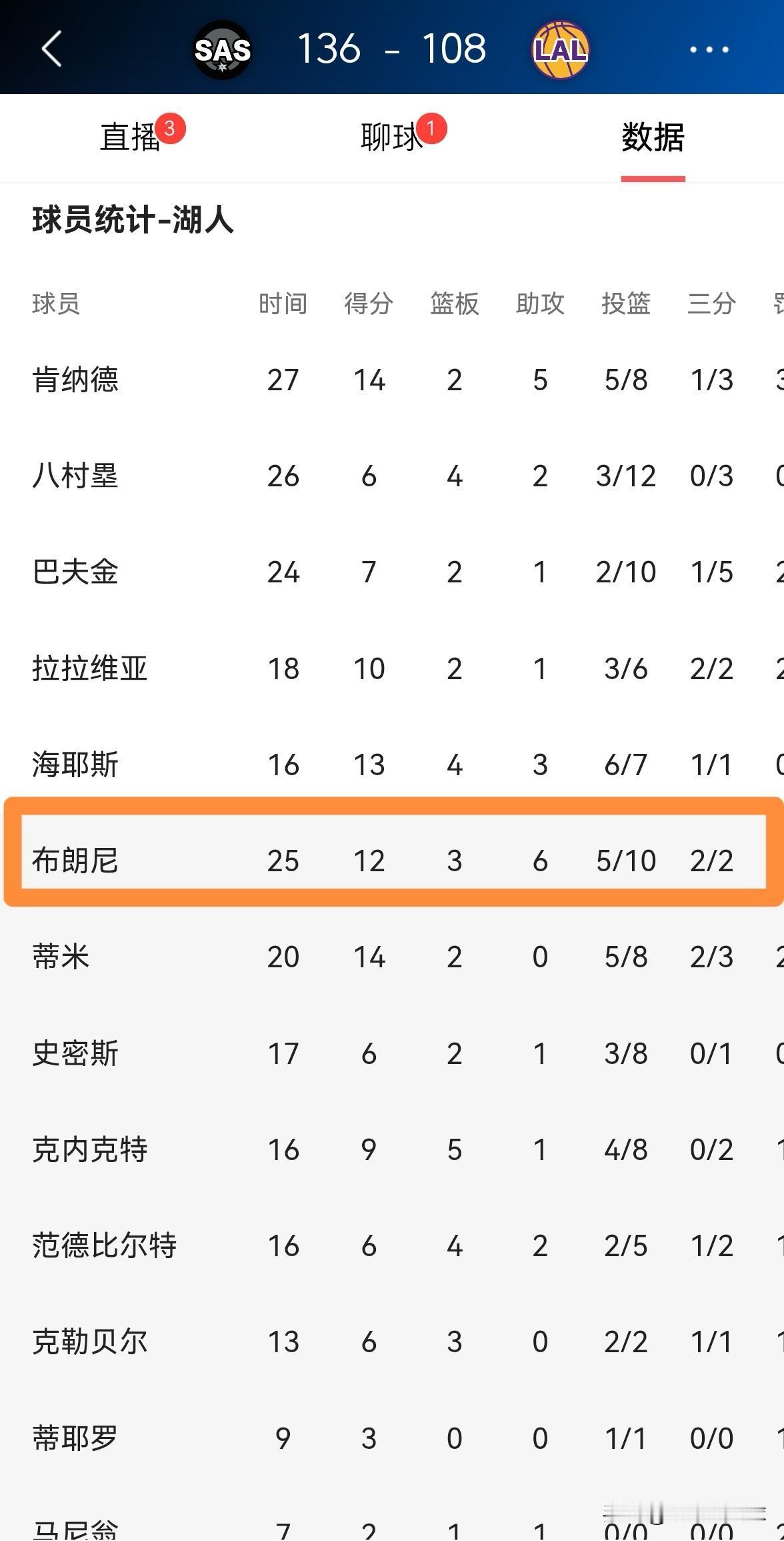 湖人新星布朗尼真是太出彩了!虽然今天湖人在主场以108:136惨败于马刺,但是小将布朗尼在攻防两端都打出了非常出场的表现。 全场比赛下来,布朗尼替补出战25分钟,投篮10中5,其中三分球2中2非常高效的砍下12分,还有3篮板6助攻1盖帽,他的场上正负值为-6。 事实再次证明,只要布朗尼能够获得充足的上场时间,他就能打出让人满意的表现。