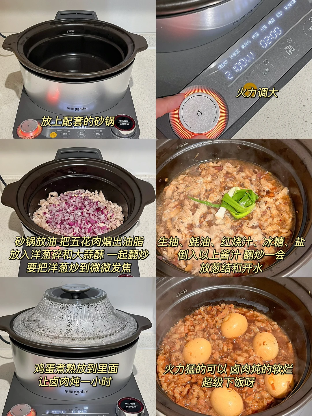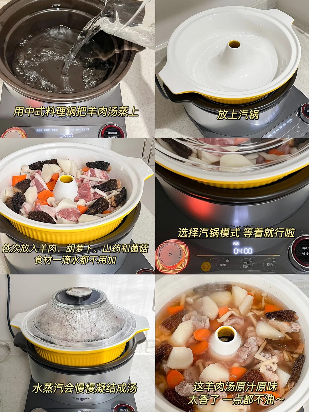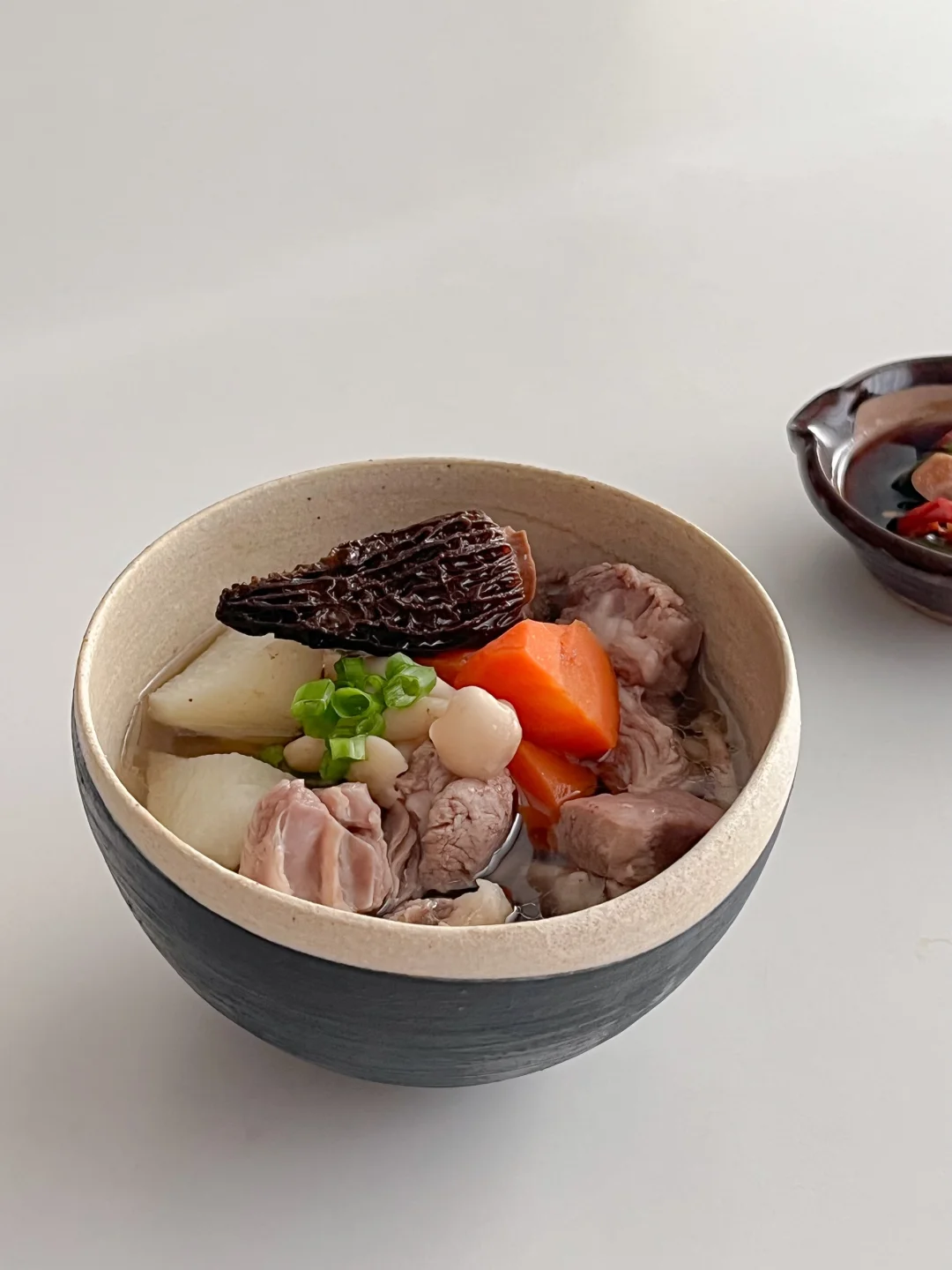 降温的日子就适合一锅热汤 尤其是羊肉锅跟冬天就是绝配 早起去菜市场买了新鲜的羊排肉 羊肉切成大块 泡冷水2个小时 山药、羊肚菌、胡萝卜、小白菇 一起放到我新买的陶瓷汽锅里 不加一滴水 全靠水汽蒸凝结成汤 整个原汁原味 每一口都是鲜美原汤 配上辣酱油的小蘸料 太舒服了 再用砂锅做一个卤肉饭🤎 想做的好吃 肉要切得小快一点 还要耐心地把猪肉的油脂煸出来 电陶炉底座火力还挺大 不熟明火 不计热量的可以把洋葱炸成酥再炖