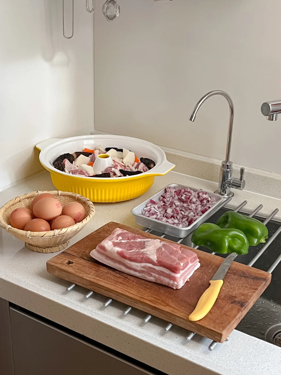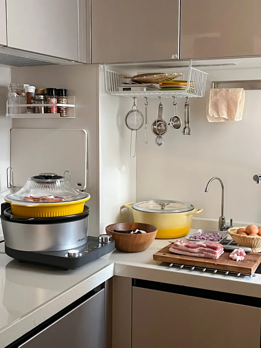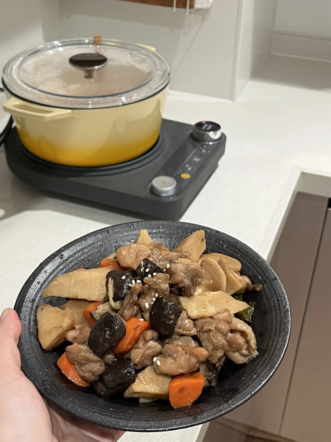 降温的日子就适合一锅热汤 尤其是羊肉锅跟冬天就是绝配 早起去菜市场买了新鲜的羊排肉 羊肉切成大块 泡冷水2个小时 山药、羊肚菌、胡萝卜、小白菇 一起放到我新买的陶瓷汽锅里 不加一滴水 全靠水汽蒸凝结成汤 整个原汁原味 每一口都是鲜美原汤 配上辣酱油的小蘸料 太舒服了 再用砂锅做一个卤肉饭🤎 想做的好吃 肉要切得小快一点 还要耐心地把猪肉的油脂煸出来 电陶炉底座火力还挺大 不熟明火 不计热量的可以把洋葱炸成酥再炖