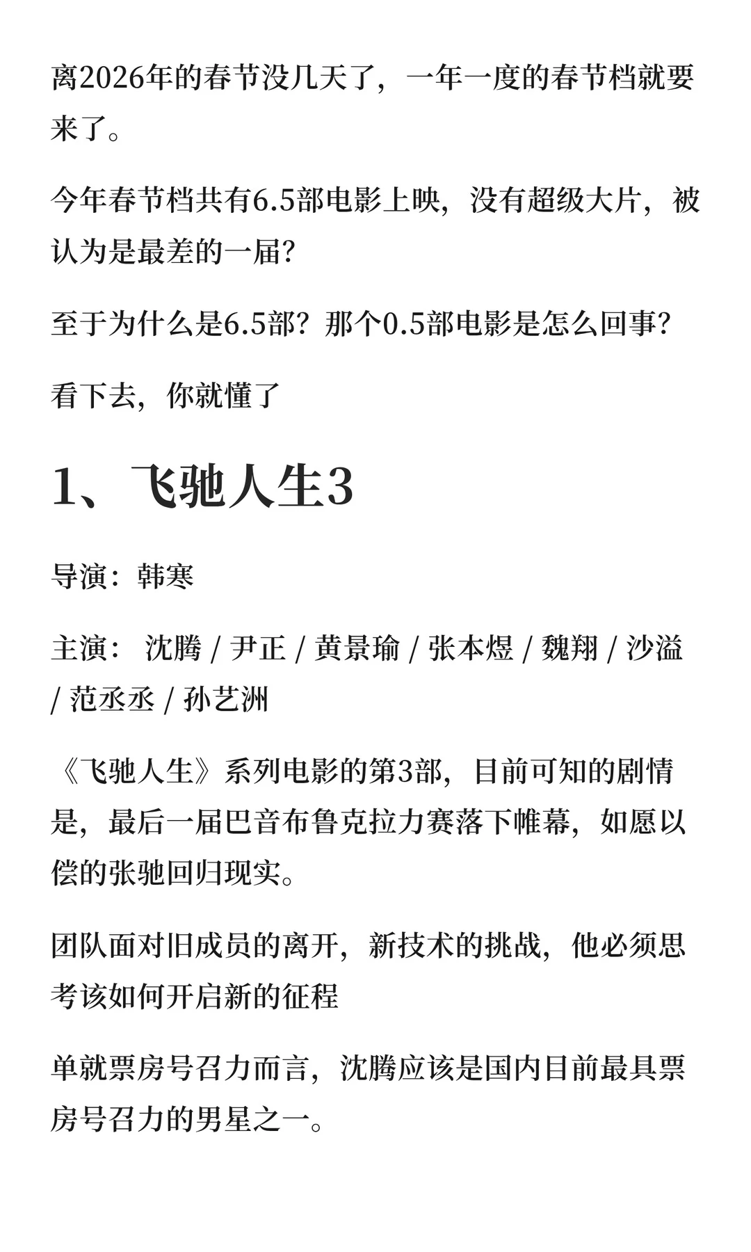 春节档预售四小时,票房冲到八千万。沈腾的《飞驰人生3》已经三千万了。韩寒导演,