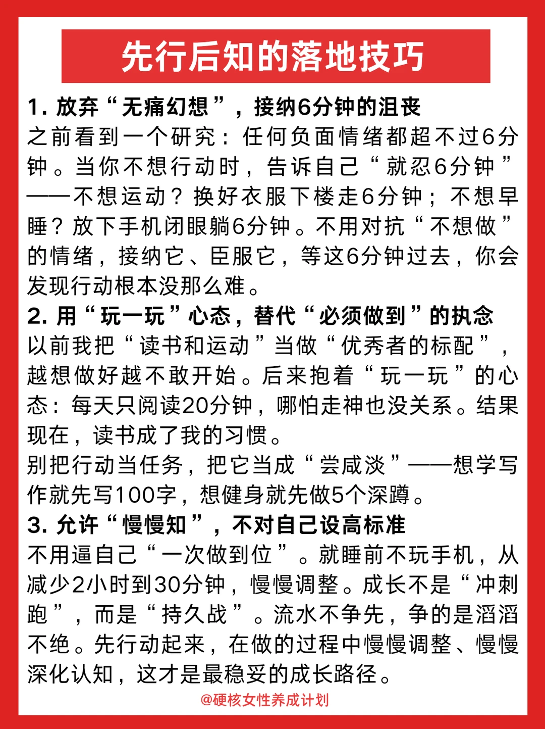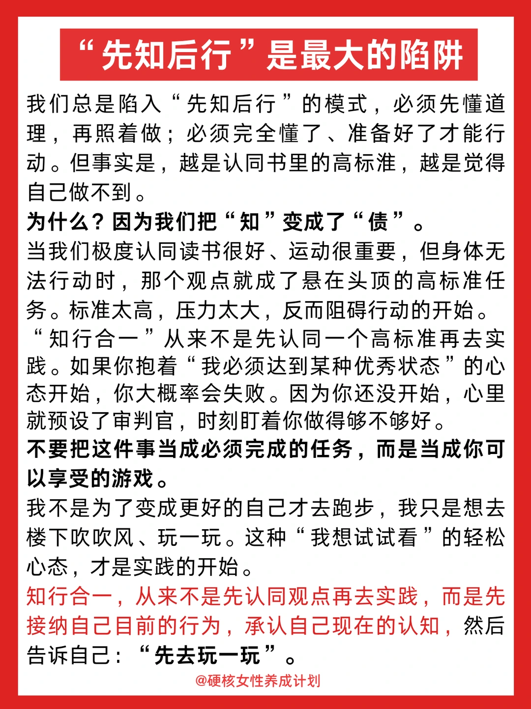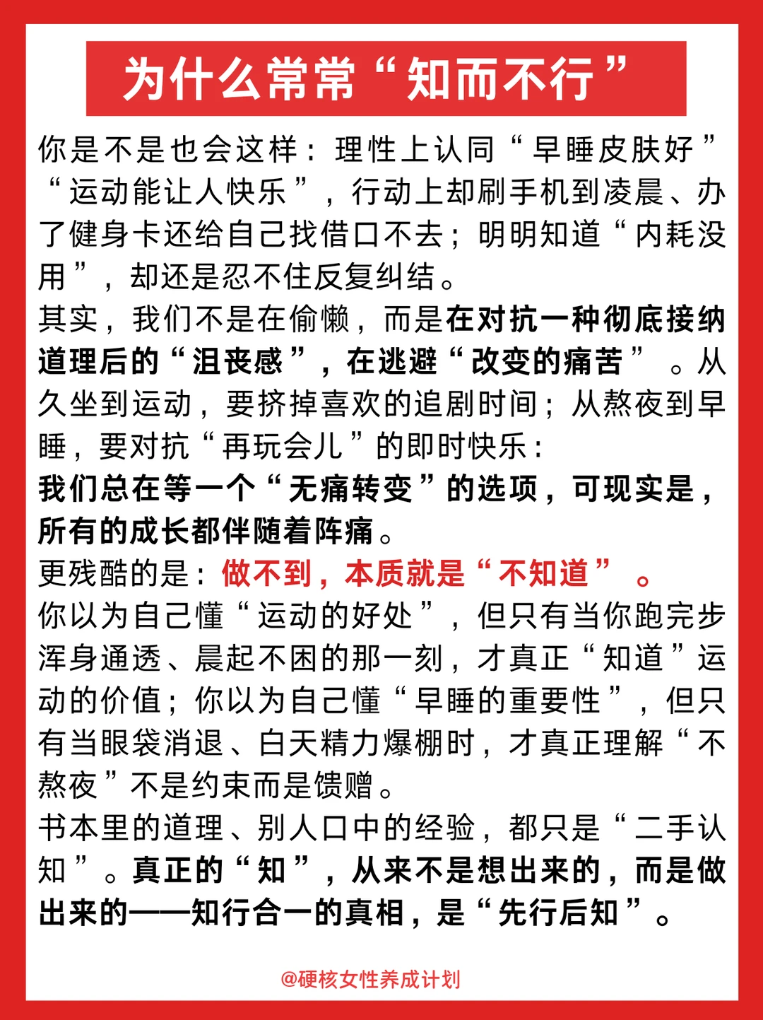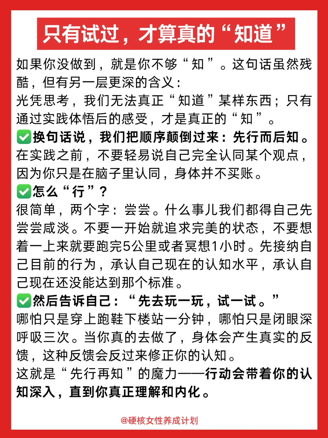 哈喽,姐妹们,好久不见。我是你们的老朋友硬核女性养成计划。停更的这段时间,我没有停止思考和成长,在生活的实践中,对“知行合一”有了全新的理解,想要跟大家分享一下~ 相信大家都有过这种情况:道理我都懂,但是真的做不到,今天,我想和大家分享一个可能颠覆你认知的观点:假如没能行,就是不知;但我们可以先行,再慢慢知。这是知行合一的底层逻辑,也是拒绝内耗的顶级心法