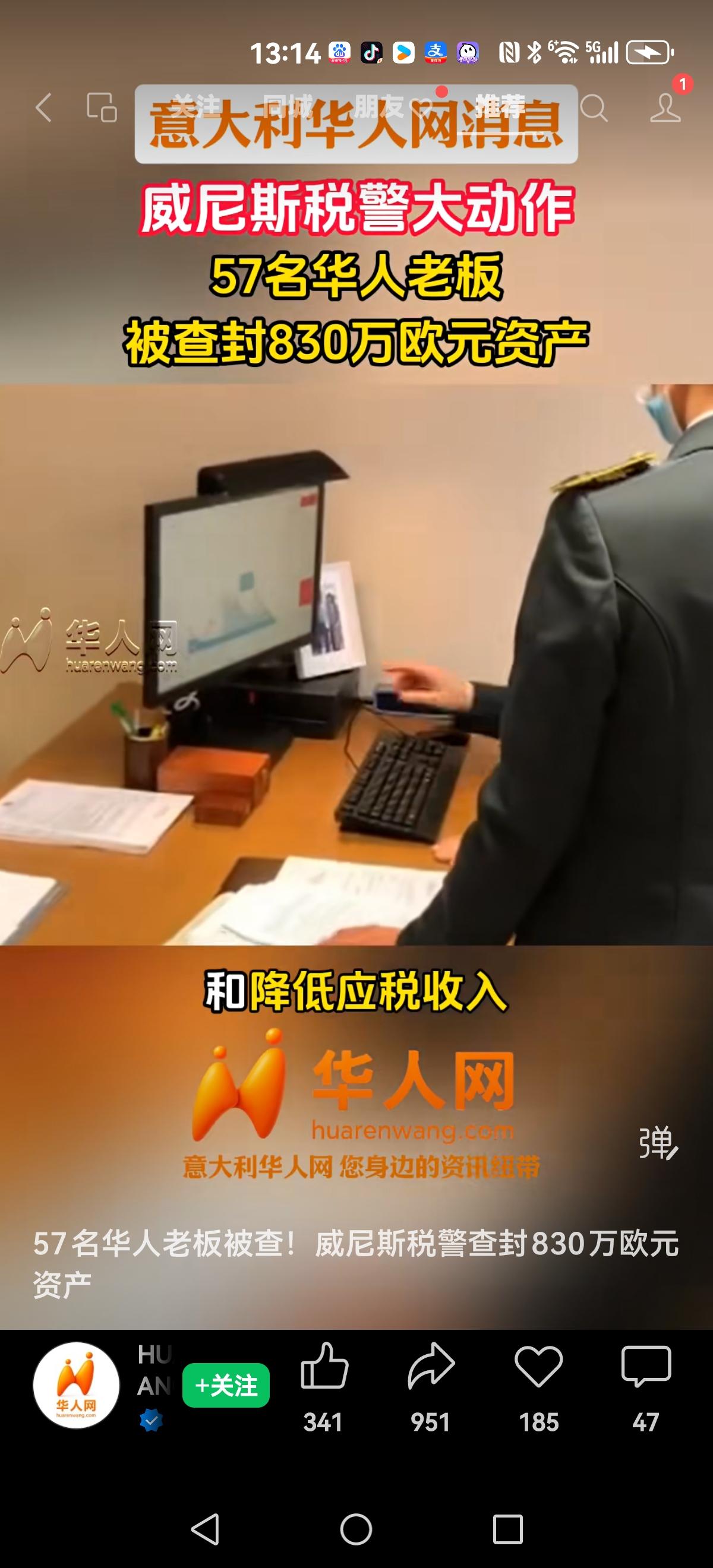 【又闯祸了】 威尼斯锐务局查封了57名公司的老板。 几乎都是华人,他们相互之间开假发票,骗取税金,然后大肆挥霍,名表名车。 这次出击,有的逃回国内,总价值830万欧元,如果判刑估计都是重罪。 这就是相互介绍经验,相互勾结。