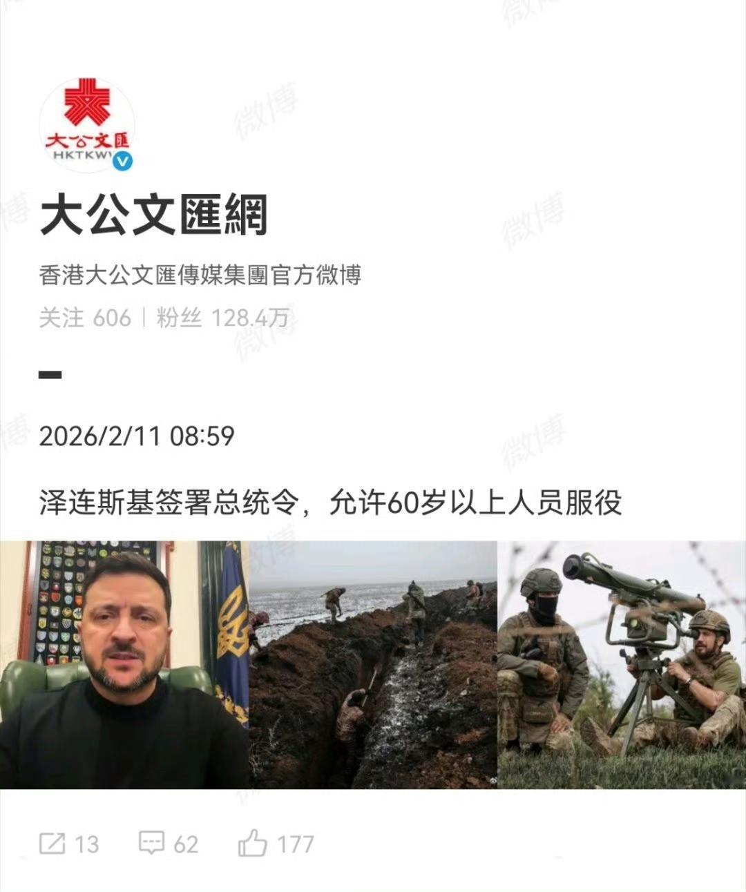 乌克兰话说战斗到最后一人看来不是说说而已! 乌克兰总统泽连斯基于2026年2月10日签署法令允许60岁以上公民以合同兵身份服役,这一政策直接源于俄乌冲突持续近四年导致的兵源系统性枯竭,本质是人力危机下的无奈之举。 60岁服合同兵役看来是真要把人口打完了!