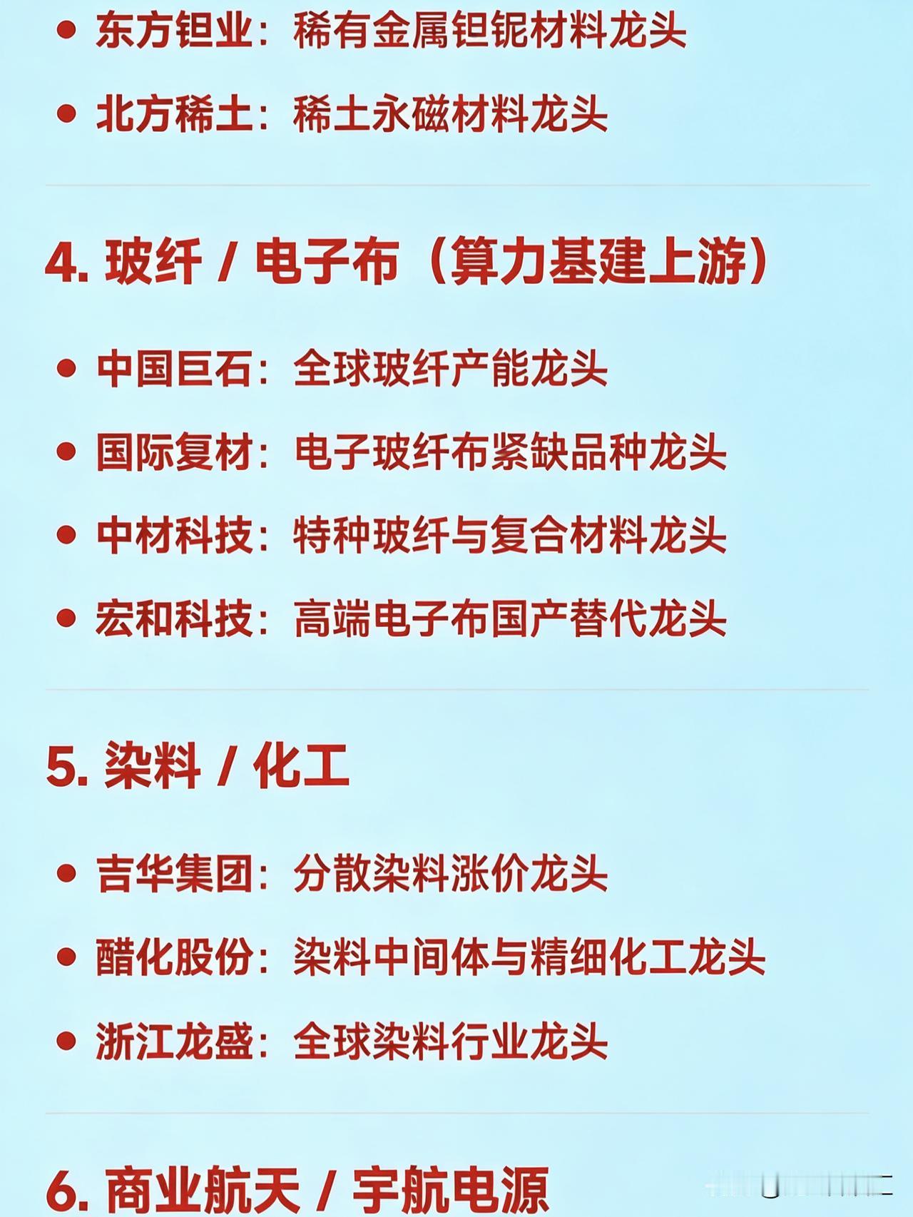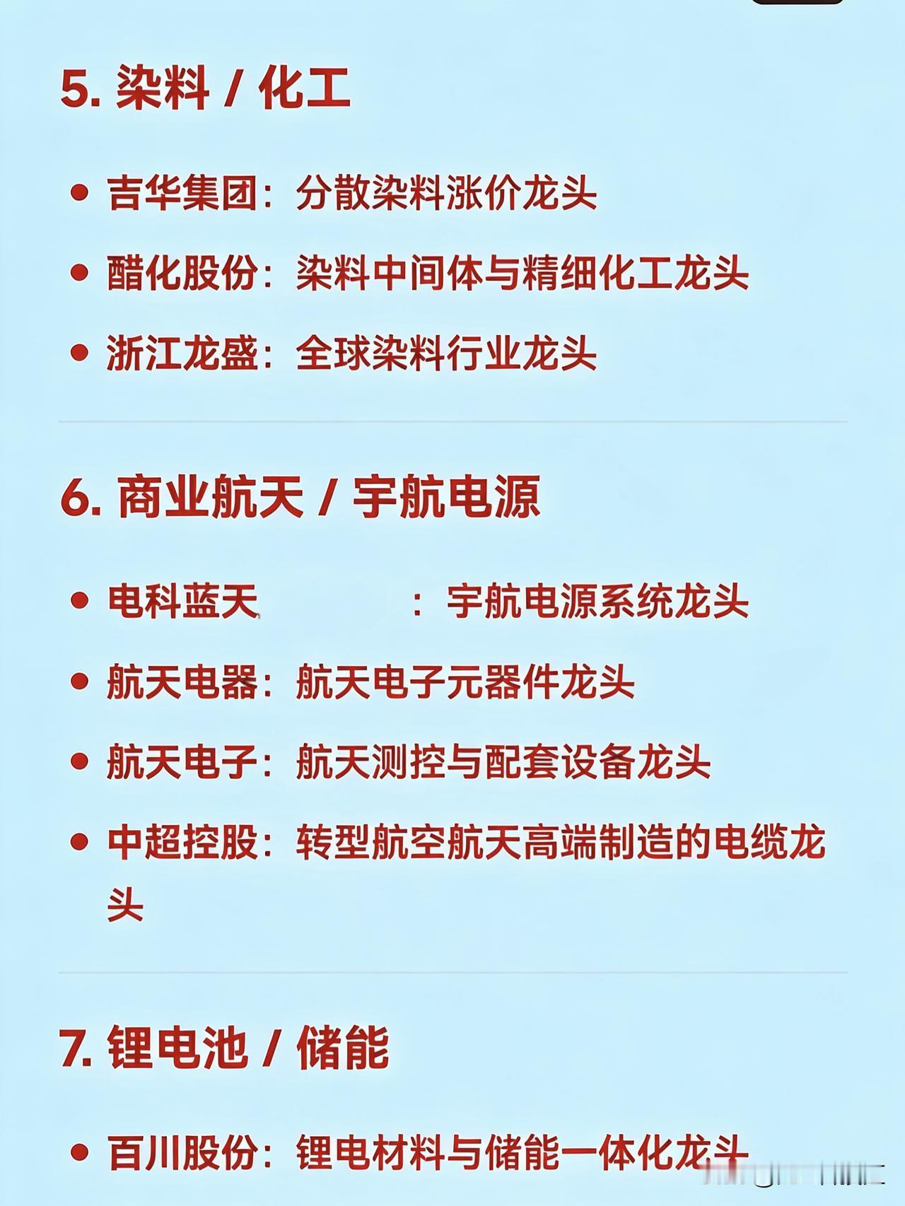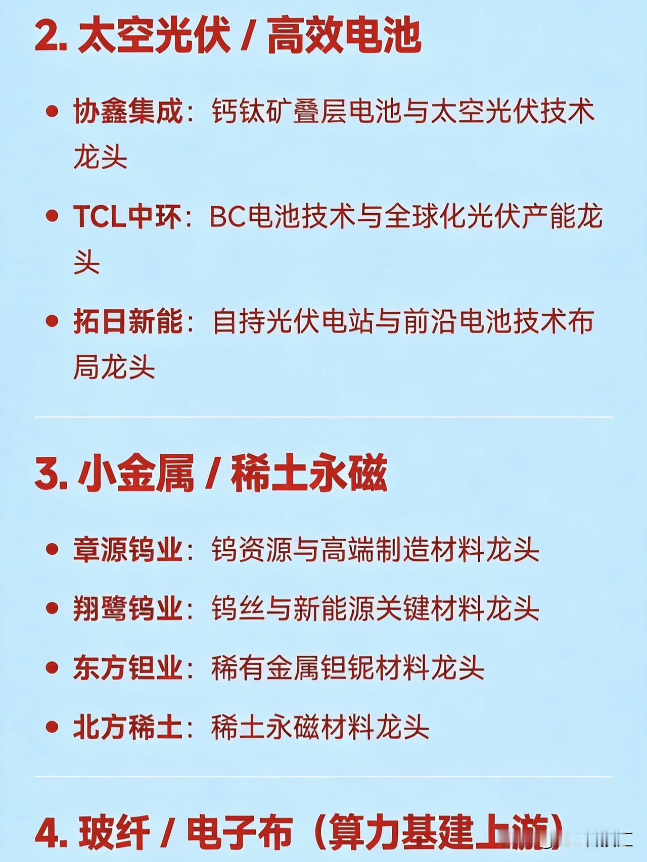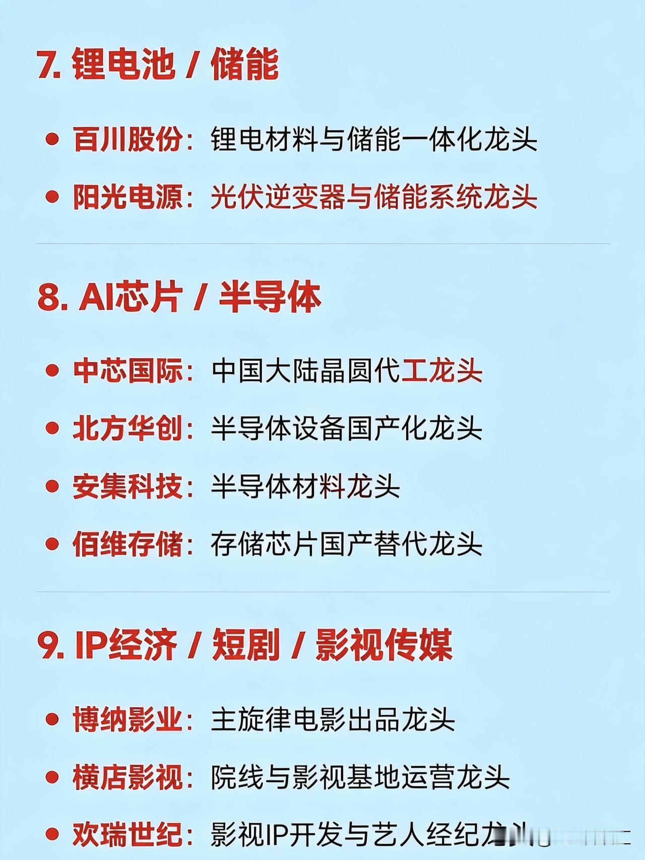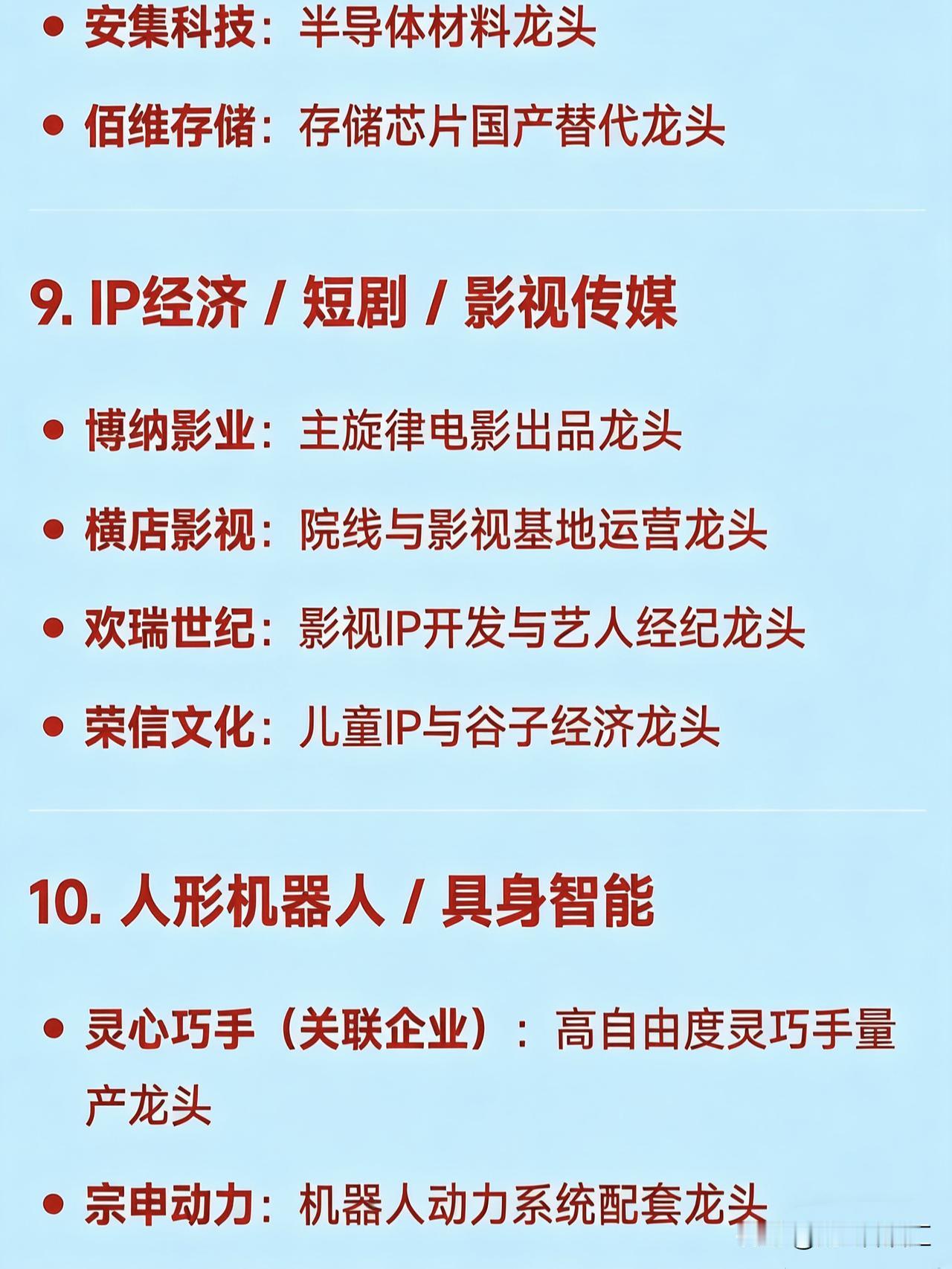 2026年2月11日十大热点科技及其产业链核心龙头 1. AI视频 / 文生视频(Sora / Seedance 概念) 捷成股份:新媒体版权运营与AI语料龙头 掌阅科技:数字阅读与AI漫剧龙头 中文在线:AIGC内容生态与AI语料龙头 光线传媒:春节档影视与AI影视宣发龙头 三六零:AI安全与国产大模型应用龙头   2. 太空光伏 / 高效电池 协鑫集成:钙钛矿叠层电池与太空光伏技术龙头 TCL中环:BC电池技术与全球化光伏产能龙头 拓日新能:自持光伏电站与前沿电池技术布局龙头   3. 小金属 / 稀土永磁 章源钨业:钨资源与高端制造材料龙头 翔鹭钨业:钨丝与新能源关键材料龙头 东方钽业:稀有金属钽铌材料龙头 北方稀土:稀土永磁材料龙头   4. 玻纤 / 电子布(算力基建上游) 中国巨石:全球玻纤产能龙头 国际复材:电子玻纤布紧缺品种龙头 中材科技:特种玻纤与复合材料龙头 宏和科技:高端电子布国产替代龙头   5. 染料 / 化工 吉华集团:分散染料涨价龙头 醋化股份:染料中间体与精细化工龙头 浙江龙盛:全球染料行业龙头   6. 商业航天 / 宇航电源 电科蓝天:宇航电源系统龙头 航天电器:航天电子元器件龙头 航天电子:航天测控与配套设备龙头 中超控股:转型航空航天高端制造的电缆龙头   7. 锂电池 / 储能 百川股份:锂电材料与储能一体化龙头 阳光电源:光伏逆变器与储能系统龙头   8. AI芯片 / 半导体 中芯国际:中国大陆晶圆代工龙头 北方华创:半导体设备国产化龙头 安集科技:半导体材料龙头 佰维存储:存储芯片国产替代龙头   9. IP经济 / 短剧 / 影视传媒 博纳影业:主旋律电影出品龙头 横店影视:院线与影视基地运营龙头 欢瑞世纪:影视IP开发与艺人经纪龙头 荣信文化:儿童IP与谷子经济龙头   10. 人形机器人 / 具身智能 灵心巧手(关联企业):高自由度灵巧手量产龙头 宗申动力:机器人动力系统配套龙头