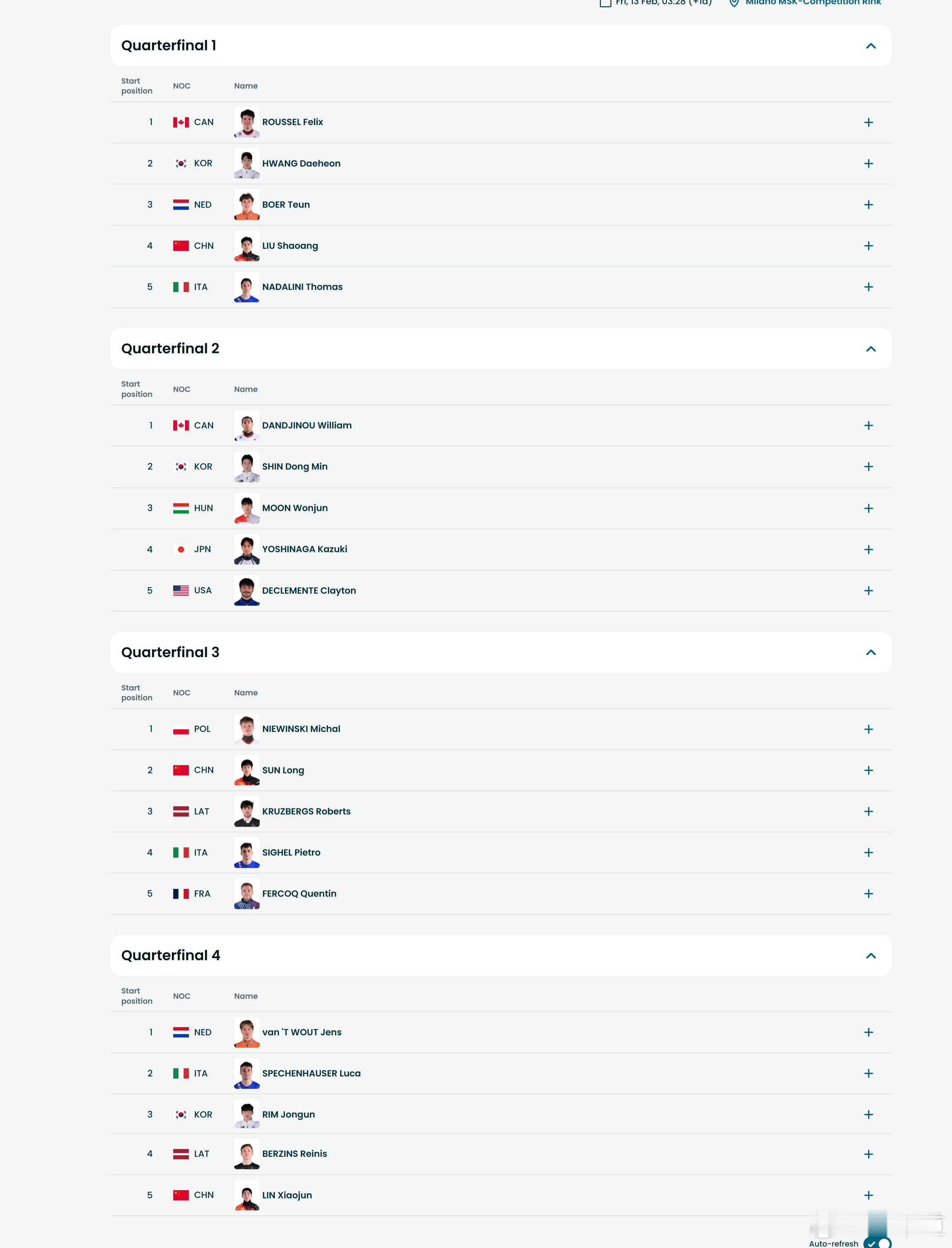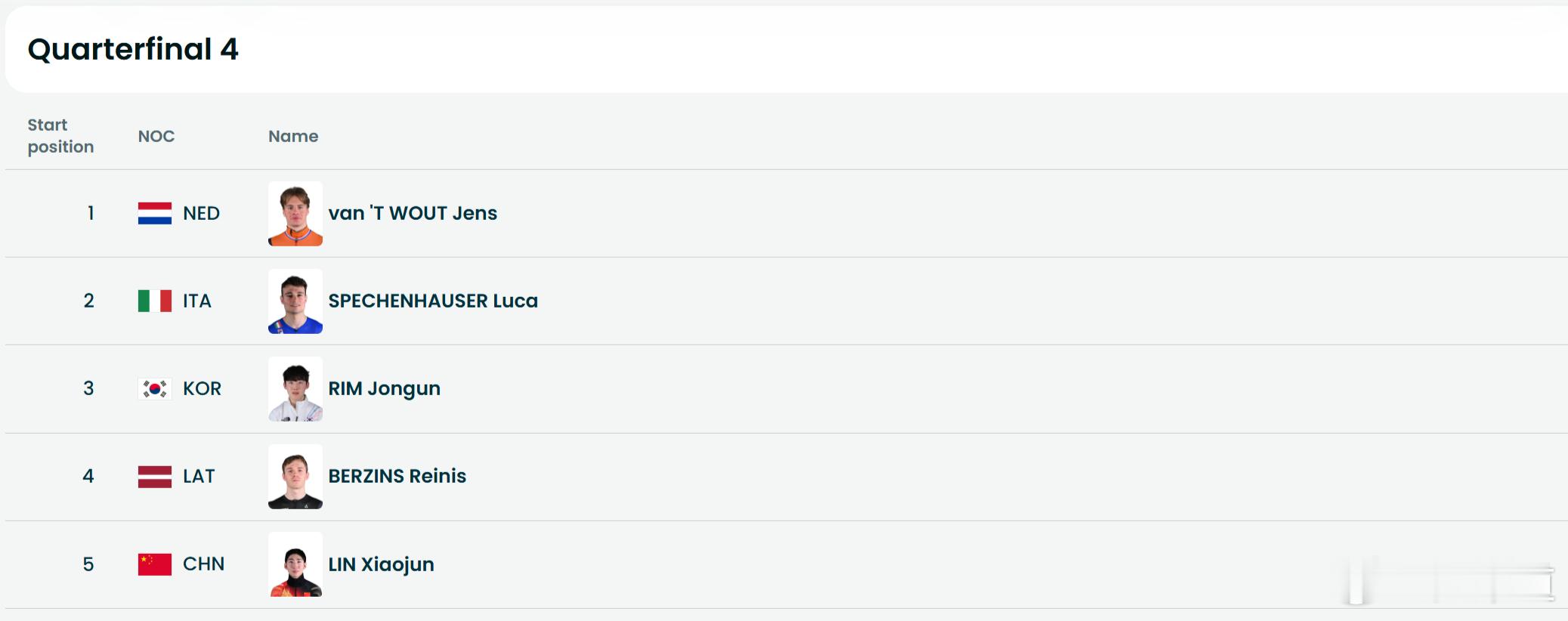 冬奥会林孝埈短道速滑男子1000米1/4决赛分组出来了,林孝埈第四组,孙龙第三组