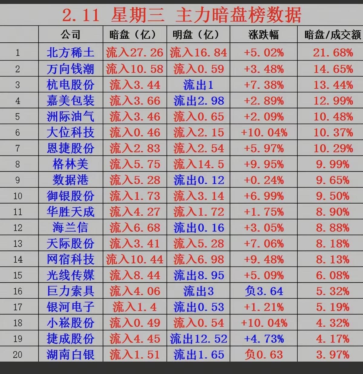 2.11周三 主力暗盘资金 抢筹个股榜! 资金抢筹: 主要围绕 :能源金属,有色金属,小金属钨,锂电池相关,六氟磷酸锂,化工原料等