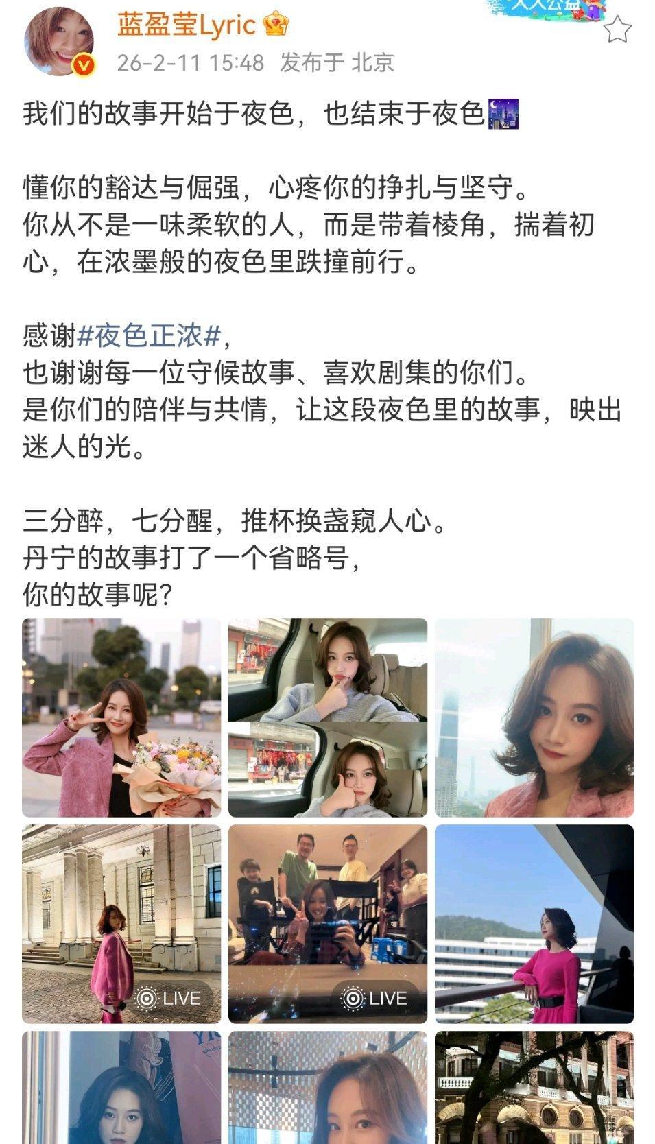 蓝盈莹告别梁丹宁 蓝盈莹发文“感谢夜色正浓,也谢谢每一位守候故事、喜欢剧集的你们。是你们的陪伴与共情,让这段夜色里的故事,映出迷人的光。”感谢蓝盈莹把梁丹宁带到我们年前!蓝盈莹告别夜色正浓 蓝盈莹