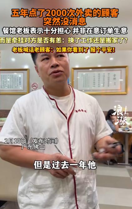 广东佛山,一男子开了家粤菜馆,有个顾客5年点了2000次外卖,突然1年多没下单,男子很是牵肠挂肚,他不是想挣这个顾客的钱,而是担心对方的安危,不知道是换工作了还是搬家了,男子喊话:如果你看到了,报个平安! 在佛山禅城的老街区里,有一家经营了十几年的家常粤菜馆,他们没有花哨的网红装修,也不靠铺天盖地的营销造势,全凭实打实的地道粤式风味,留住了一波又一波回头客。 店里的外卖订单每天来来往往,大多是匆匆过客,尝过一次便再无交集,可有一个顾客的 ID,却在后台停留了整整五年。 五年时间,一千八百多个日夜,这位顾客累计下单超过两千次,算下来几乎每天都要光顾一次,有时候忙起来一天两单,成了菜馆最忠实的老熟人。 老板和伙计们从没见过这位顾客的模样,却把他的口味记得比自家亲戚还清楚,连下单时间都固定在中午十二点和傍晚六点半,像是刻在日程里的习惯。 每次备这位顾客的餐,后厨都会格外上心,汤要煲足三个时辰,火候不能差一分,烧腊要刚出炉就斩盒,保证送到手上还是热乎的,外卖盒的封口会多缠一圈胶带,防止汤洒出来、饭凉得快。 遇到食材特别新鲜的时候,老板还会顺手多添一勺料,或是给汤里加块瘦肉,不用额外加钱,只是觉得这位老顾客值得这份用心。 在老板心里,这早已不是一单简单的生意,五年的朝夕相伴,一餐餐热饭的传递,让素未谋面的两个人,有了无声的默契。就像远方的亲友,不用天天见面,却知道对方一直在,这份踏实,是小餐馆里最珍贵的温暖。 这样安稳的陪伴,一直持续了五年,直到一年多前,这个熟悉的订单突然消失了。最初的几天,老板只当是顾客临时出差、休假,或是想换个口味尝鲜,并没放在心上。 可一周过去,半个月过去,一个月、两个月,那个熟悉的头像再也没有亮起,订单列表里,最后一笔记录停留在某天的傍晚,之后便是一片空白。 老板开始忍不住每天翻看外卖后台,手指划过那两千条密密麻麻的订单记录,从春天的肠粉到夏天的靓汤,从秋天的烧腊到冬天的煲仔饭,每一笔都藏着五年的时光。 他翻遍了所有订单备注,没有差评,没有抱怨,只有偶尔一句简单的 “谢谢”,干净又真诚。看着这些记录,老板心里的不安一点点蔓延开来,他开始坐立难安,熬汤的时候会走神,斩料的时候会顿手,总觉得少了点什么,空落落的。 身边的朋友和伙计打趣他,说少了一个大客户,心疼营业额了。 老板听了只是摇头,脸上满是认真,他说自己开了这么多年餐馆,生意起起落落早就看淡了,多一单少一单,对店里的影响微乎其微。他真正放心不下的,是这位陪伴了五年的老顾客,到底遇上了什么事。 他一遍遍在心里猜测,是不是换了工作,离开了佛山,去了别的城市打拼?是不是搬了新家,距离太远,不方便再点这里的外卖?又或是身体不舒服,没办法按时吃饭,甚至遇到了什么难处? 每一种猜测,都揪着老板的心,他不是多愁善感的人,在市井里摸爬滚打多年,见惯了人来人往,可面对这位默默支持了五年的老顾客,他终究放不下这份牵挂。 他总觉得,这位顾客就像住在附近的老街坊,每天打个照面,突然不见踪影,怎么能不惦记,大街小巷的粤菜馆数不胜数,外卖平台的选择成千上万,能五年如一日地认准一家店,是顾客对口味的认可,更是对小店的信任。 老板守着这家小馆,不求大富大贵,只希望用用心做的饭菜,给奔波的人一口热乎饭,消解一天的疲惫。 这位顾客用两千次订单,回应了这份用心,把陌生的买卖关系,熬成了淡淡的人情味,如今突然没了音讯,老板只盼着他平平安安,别无他求。 年关将近,佛山的街头渐渐有了年味,家家户户都在备年货、盼团圆,老板心里的牵挂也越来越浓。他不想打扰顾客的生活,更不想打探对方的隐私,只是单纯地想知道对方是否安好。 思来想去,他决定借着网络,跟这位老顾客说几句心里话,没有华丽的辞藻,没有刻意的煽情,只有最朴素的佛山口音,藏着满满的真诚。 他对着镜头轻轻喊话,声音温和又恳切,希望这位老顾客如果能看到,一定要报个平安。 不管是换了工作、搬了新家,还是有了新的生活,只要知道他健健康康、平平安安,自己心里的石头就能落地。 在快节奏的都市里,人和人的缘分有时候很简单,一餐饭,一份外卖,就能牵起一段淡淡的情谊。 这家小小的粤菜馆,没有惊天动地的故事,没有轰轰烈烈的情感,只有一个普通老板,对一位素未谋面的老顾客,最纯粹的惦念。 城市的脚步很快,大家都在忙着赶路,可总有一些细碎的温暖,能让我们停下脚步,感受到人与人之间最本真的善意。 对于这件事,您有什么想说的吗?欢迎评论区留言讨论。 信源:浪涨新闻2026-02-10——《近日,广东佛山一粤菜馆老板,牵挂着一位五年内累计下单超2000次的外卖老顾客,原是店里的……》