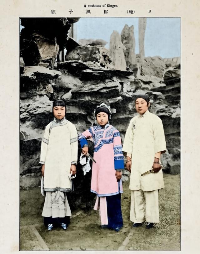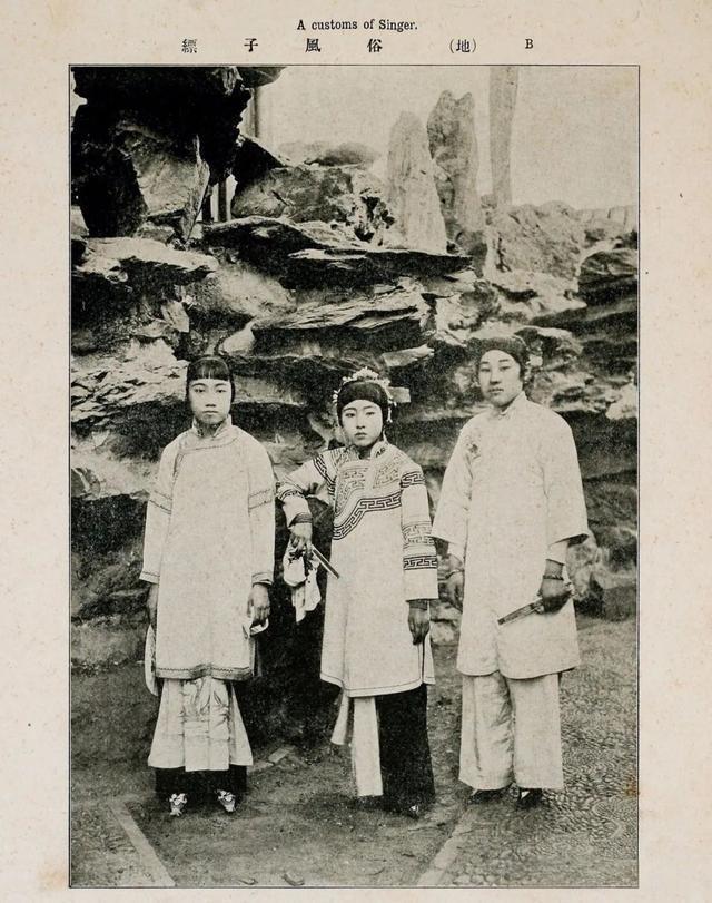 这张照片出自民国初年的画册,标题“A customs of Singer”点明了三位女子的身份。中间女子的头饰更为华丽,手持团扇;左右两人则手持折扇,这些都是当时歌女的标志性道具。她们并非普通闺秀,而是活跃于晚清至民国初年的歌女(艺伎)。 这类群体常以才艺谋生,也是较早接触摄影的女性群体,留影既为自我留念,也可作为“名片”吸引主顾。