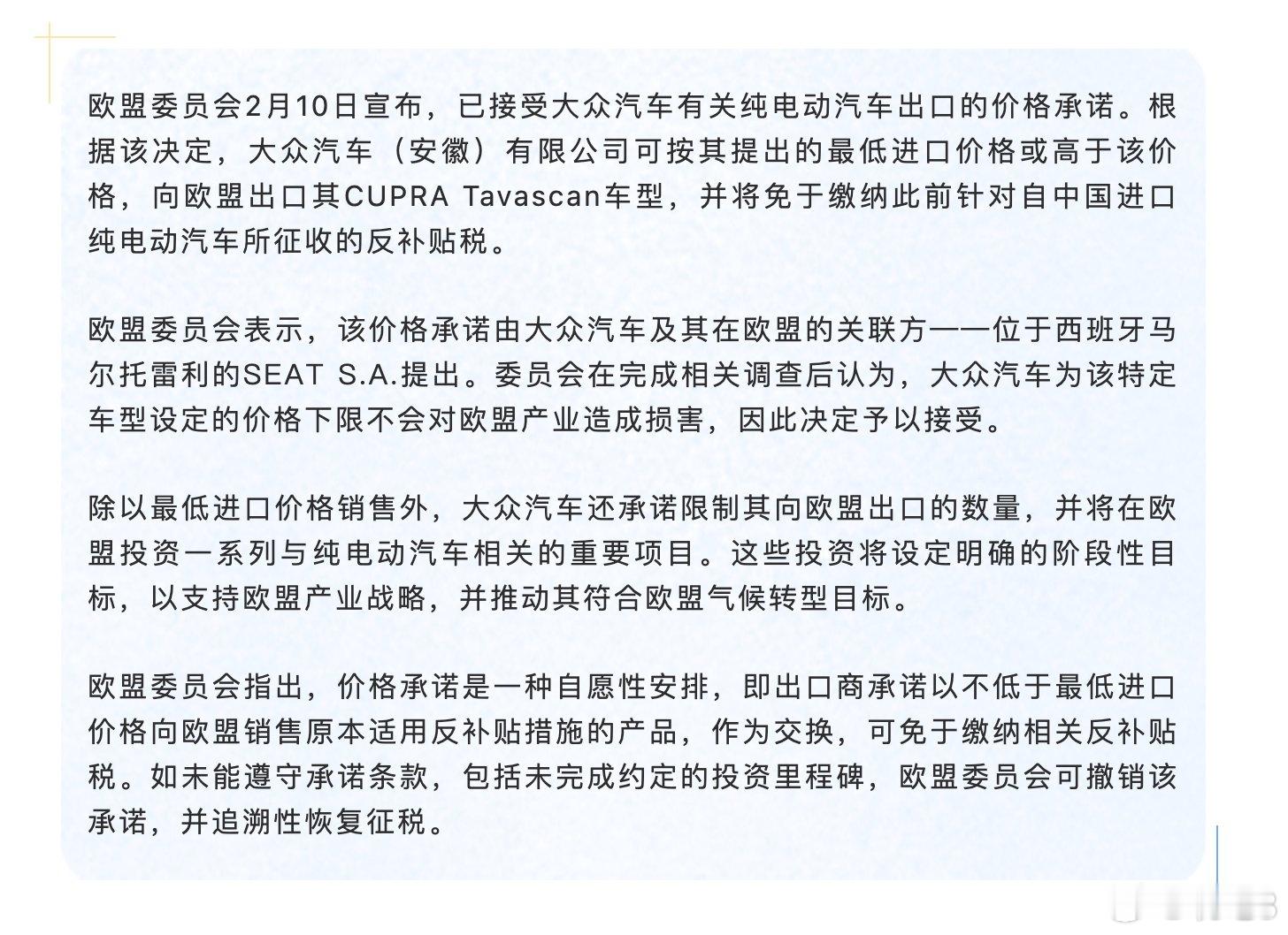 【欧盟接受大众纯电出口价格承诺大众安徽车型获免反补贴税】2 月 10 日,欧盟委员会宣布已接受大众汽车关于纯电动汽车出口的价格承诺。大众汽车(安徽)有限公司生产的CUPRATavascan 车型,按承诺最低进口价或更高价格出口欧盟,可免于缴纳欧盟针对中国进口纯电动汽车征收的反补贴税。大众方面同步作出三项承诺:执行最低出口限价、限制对欧出口数量、在欧盟落地纯电动相关投资项目,并设定明确阶段性目标,以适配欧盟产业战略与气候转型要求。新能源汽车
