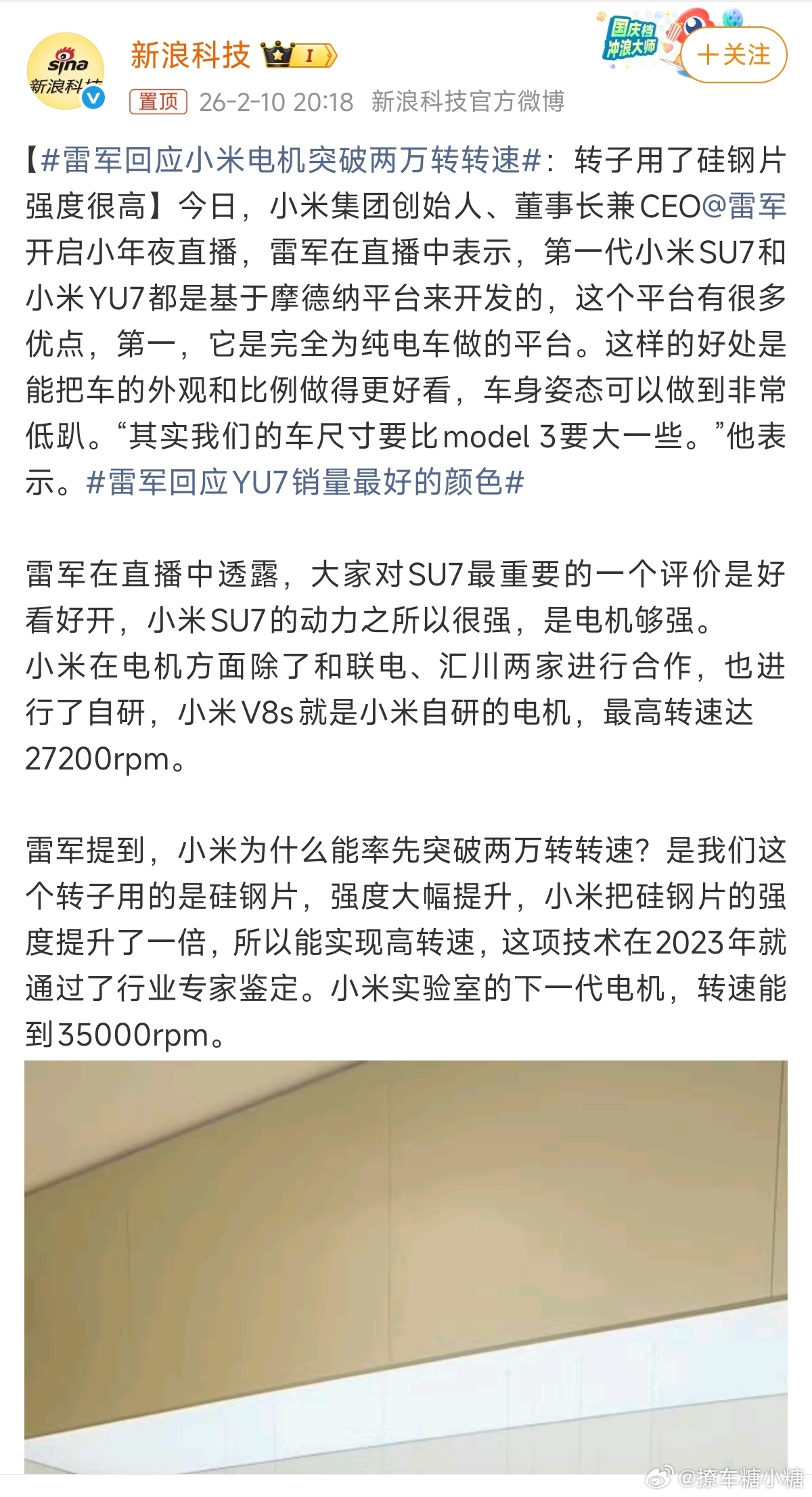 雷军回应小米电机突破两万转转速大V聊车能成为最快下线五十万的新势力车企,小米汽