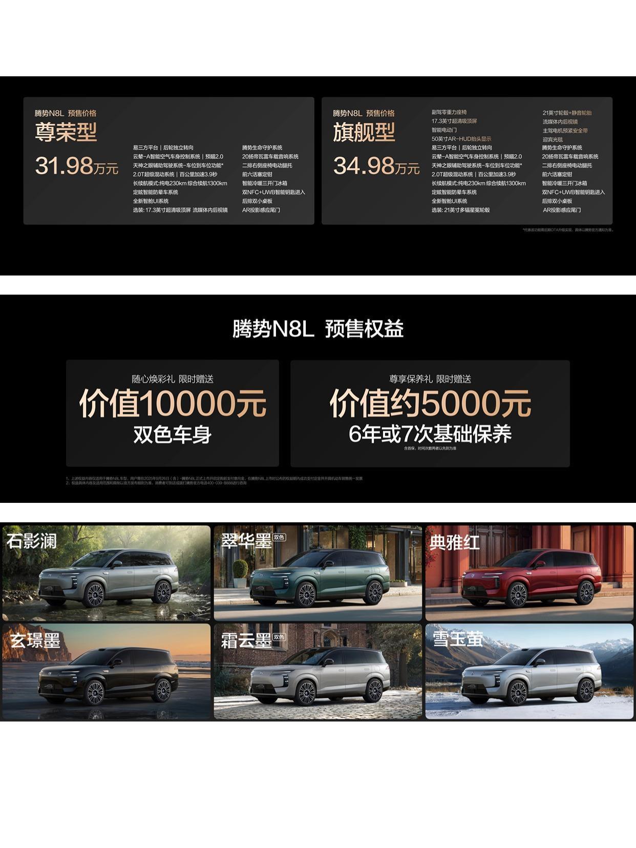 重塑大六座SUV市场新格局,腾势N8L以31.98万起正式开启预售 9月26日,腾势N8L大六座安全豪华SUV开启预售,售价31.98万起。真的是全家三代人满意之选 1设计方面 整体设计上,腾势N8L延续家族“优雅之势”设计语言,宽阔舒展,沉稳大气,很好展现出大型SUV应有的从容气场。腾势N8L带来六款外观颜色,每一款都独特而优雅。 内饰设计采用舒缓的线条、温和的色调和亲肤的材质,在云锦米、金山棕、铂檀灰三款配色的映衬下,宛如优雅的起居室。 2 配置方面 新车全系标配易三方、云辇-A+路面预瞄2.0,兼具强劲性能与灵活驾控,零百加速仅3.9秒。采用“优雅之势”设计语言,提供六款外观与三款内饰配色,空间宽敞,三排电动座椅支持多种组合,储物丰富。 安全方面配备多项主动稳定系统与高强笼式车身,全面守护出行。 智能配置丰富,包括17.3英寸吸顶屏、帝瓦雷音响、AI智能体、车载冰箱及激光辅助驾驶,打造家庭豪华出行新标杆。 3 腾势N8L和腾势N9区别 腾势N9定位科技安全旗舰SUV,科技力拉满、豪华感十足,更追求旗舰的科技性能。 腾势N8L则是更聚焦家庭的安全豪华SUV,继承了N9的安全技术和灵活驾控,有大空间和豪华感,更追求家庭的豪华舒享。 总之,腾势N8L作为腾势品牌旗舰豪华双子星矩阵的战略车型,重新定义了高端豪华家庭SUV的出行新体验。是真正让全家三代人满意之选,大六座安全豪华SUV,让家庭出行不止于抵达,更成为满载温馨与安心的幸福体验,成为更多家庭的“美好出行家”。比亚迪 新车上市