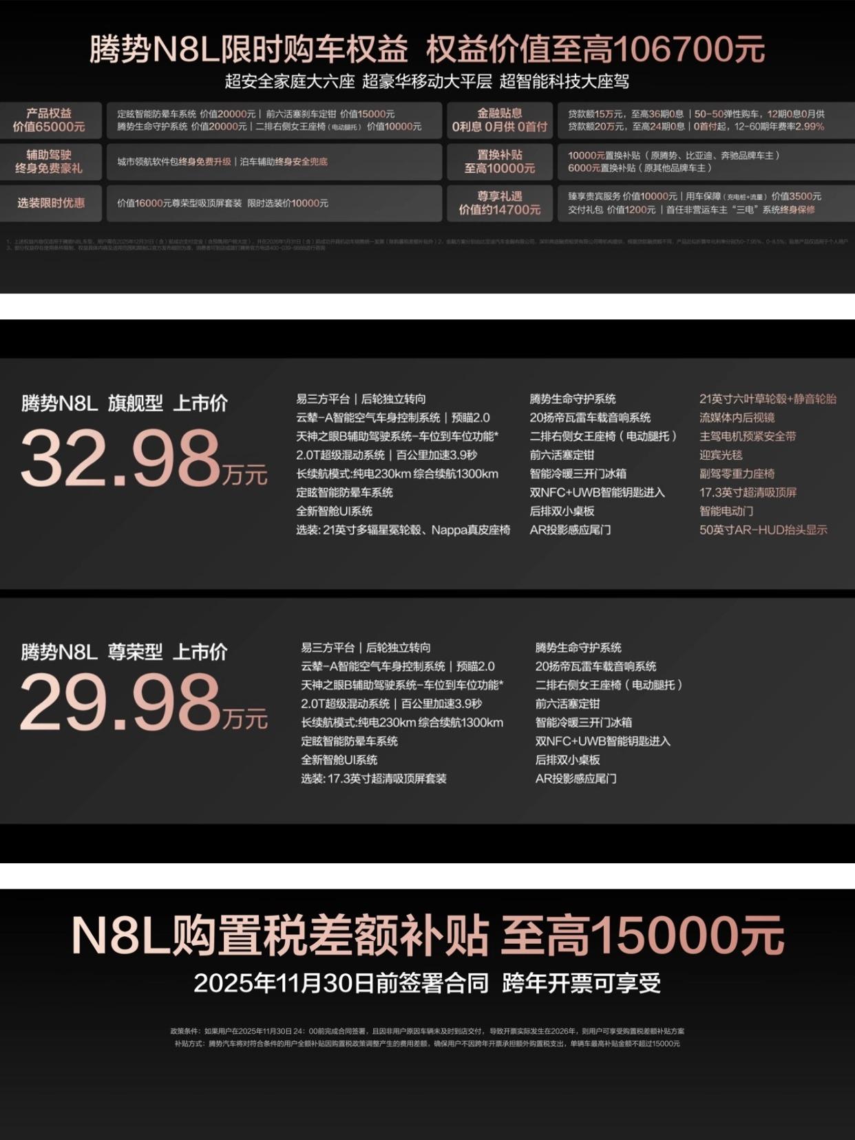 重塑家庭豪华SUV新标准,“超豪华移动大平层”腾势N8L正式上市,29.98万元起! 10月28日,腾势N8L正式上市啦,定位“大六座安全豪华SUV”,售价29.98万-32.98万元。 新车全系标配易三方智能控制平台、云辇-A空气悬架、插混2.0T+三电机,零百加速3.9秒,CLTC纯电230km、综合1300km,转弯半径仅4.58米。车长5.2米,套内6.11㎡,三排宽敞,六座电动一键切换4+N场景,最低离地11.5cm,老人儿童轻松上下。 内饰方面,31.8㎡软包、透光真木、11L三开门冰箱、17.3英寸吸顶屏、20扬声器帝瓦雷、零甲醛座舱,打造“移动大平层”。 安全方面,2000MPa热成型钢+CTB结构、9气囊,128km/h避障不甩尾、180km/h爆胎不失稳,获称“安全之王”。标配激光版DiPilot 300,端到端大模型,支持下车泊入、车位到车位。限时权益最高10.67万元,含三年免息、置换补贴、购置税补差。 腾势N8L越级价值终极满足,以“超安全、超豪华、超智能”重塑家庭SUV标杆。【来自懂车帝车友圈】